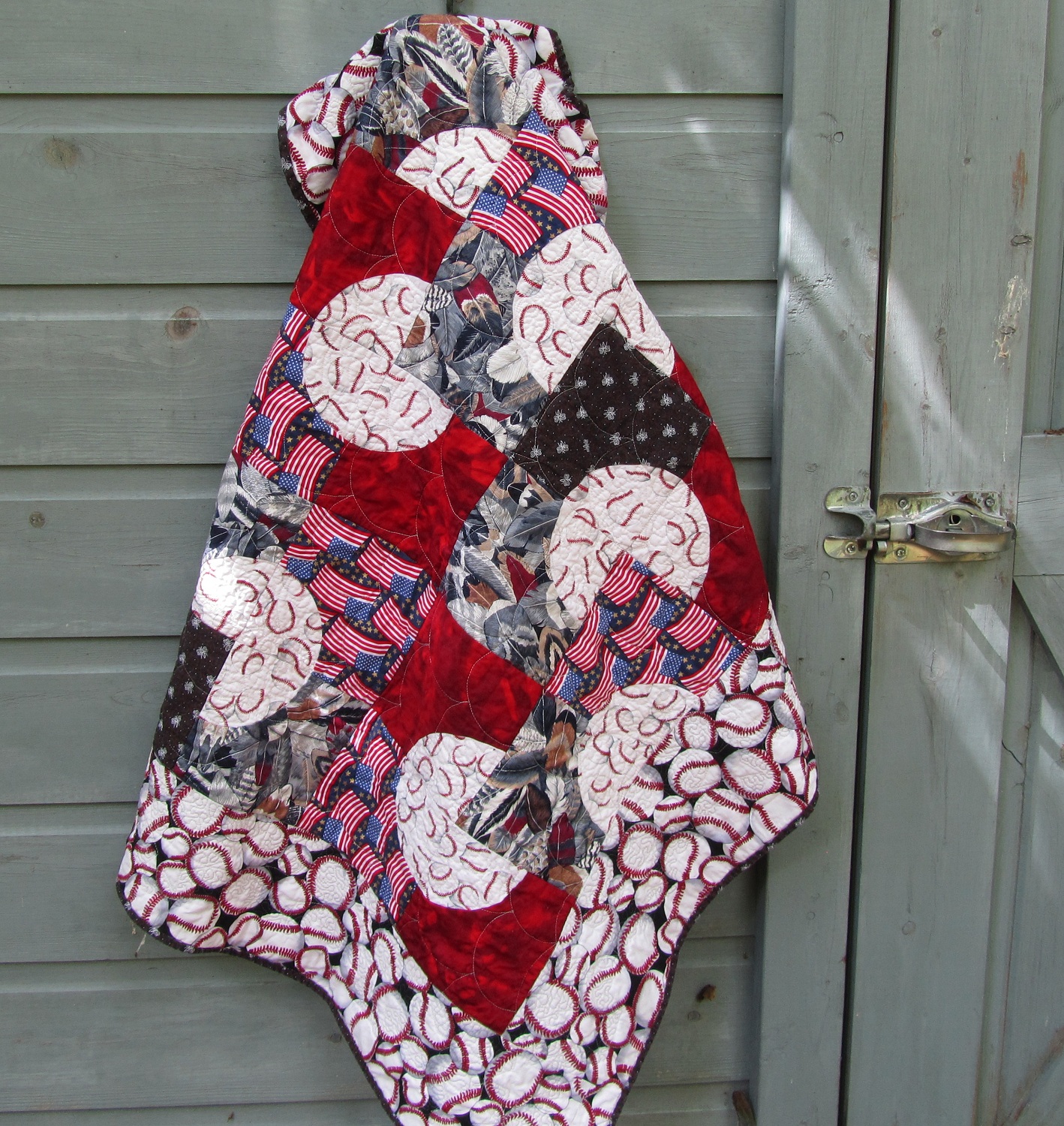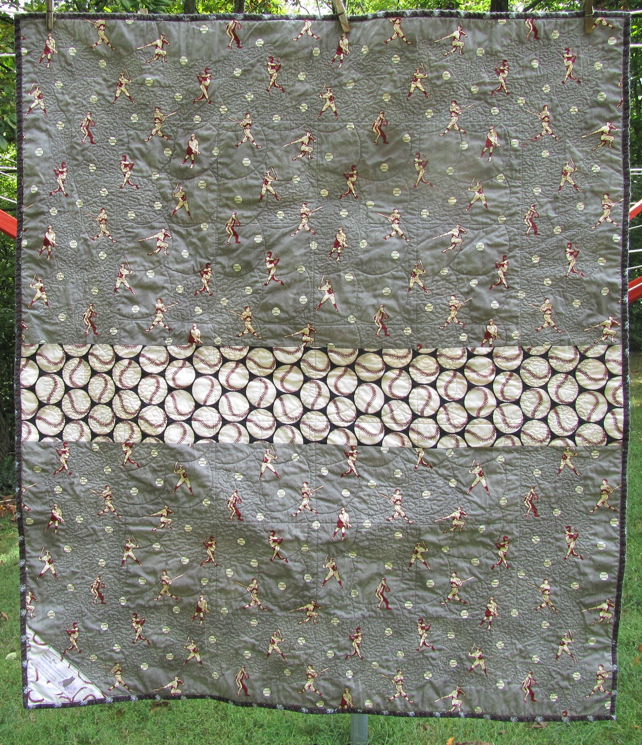 You like pink baseballs, right? I was too distressed to take a picture, but, trust me, they were quite pink. Not the printed ones in the border or back, just the large baseball motifs formed by the Drunkard’s Path blocks.