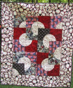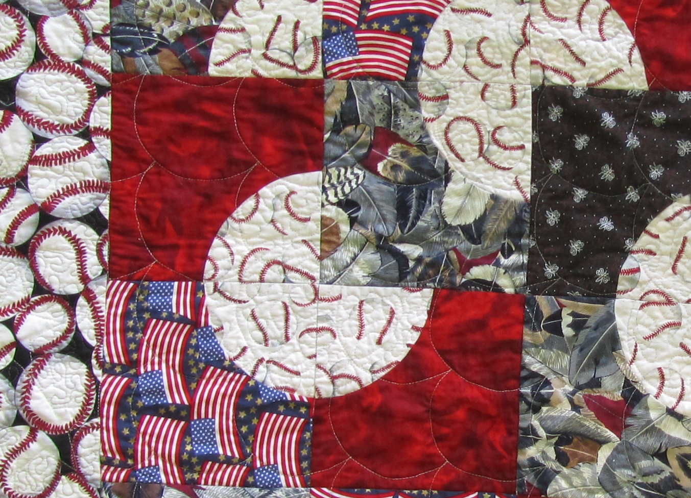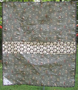 This quilt doesn’t lie as flat as I would like, and I know it’s because of the uneven amount of quilting, but I’m not sure what I would do differently. I quilted clam shells all over the field, then stippled the baseballs only. Then border has stars with stippling around to set them off. Maybe more, smaller clam shells?