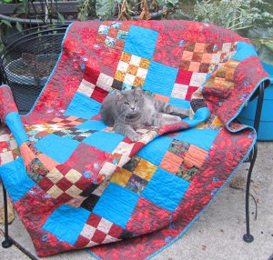 I know I had prewashed the red fabric with Color Catchers, but I still should have used them to wash the quilt. I don’t know where my brain was. And it wasn’t a hand dye as I thought, it was a Nancy Crow print that looked like one.