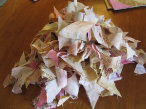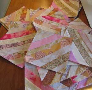 I love to make string blocks, but I really was going to use Christmas colors for my next one. When I went to clean up my scraps from the M. M. Zig Zag quilt, I found that my strings have been breeding again, overflowing their containers, and the new pink and yellow ones wouldn’t even fit. So here are thirty-five 8″ string blocks in that same color scheme. Why mess with success?