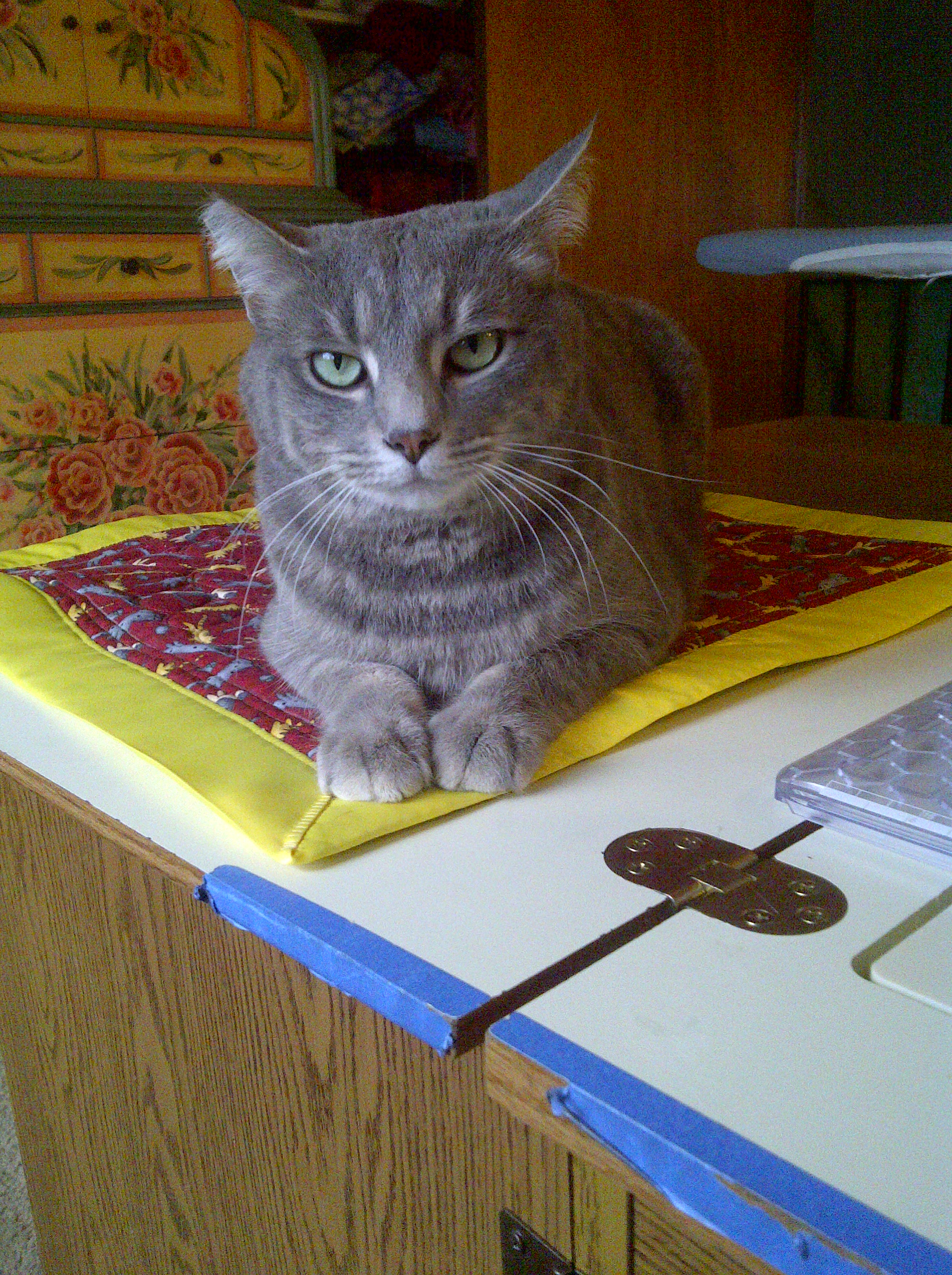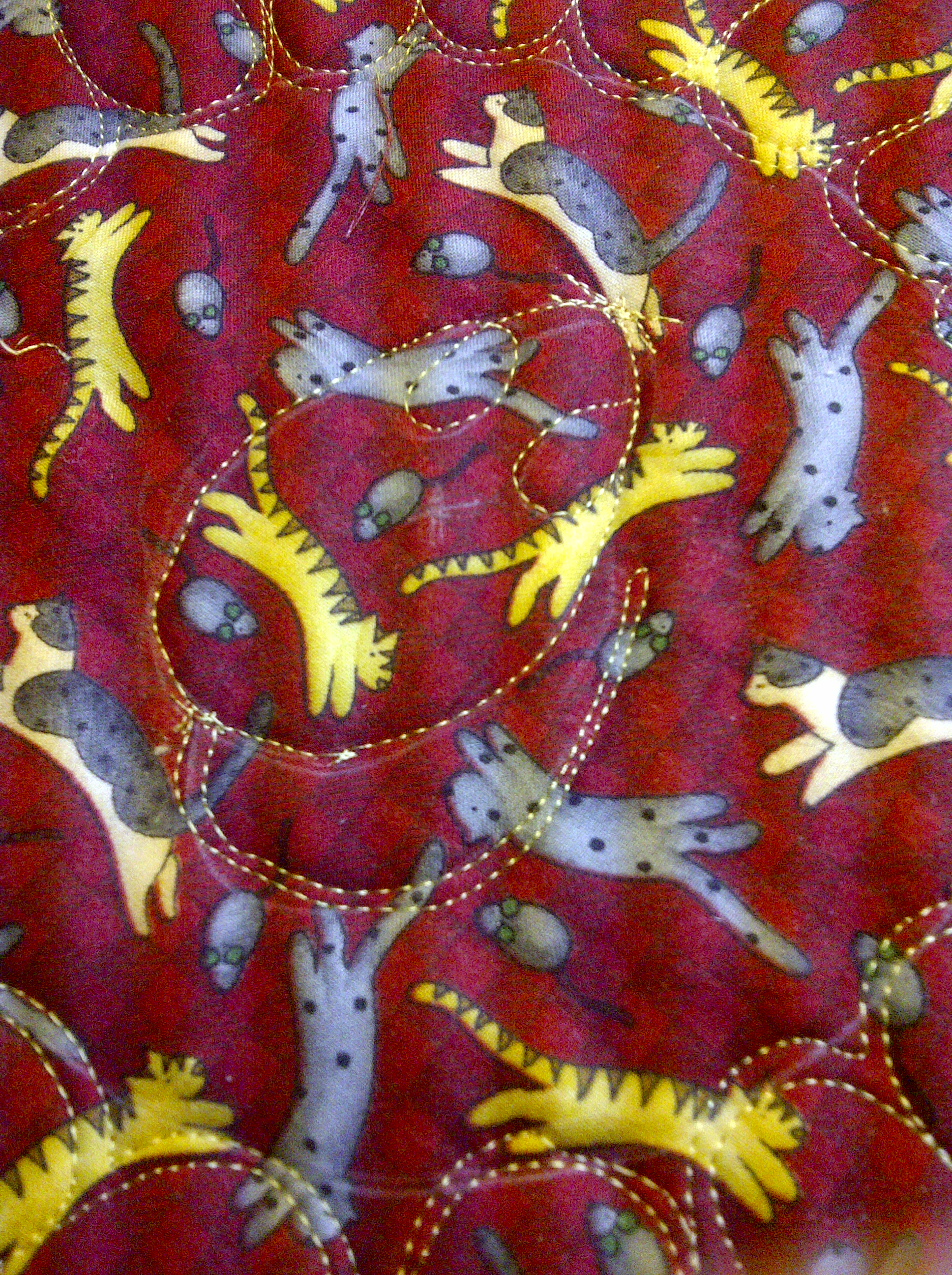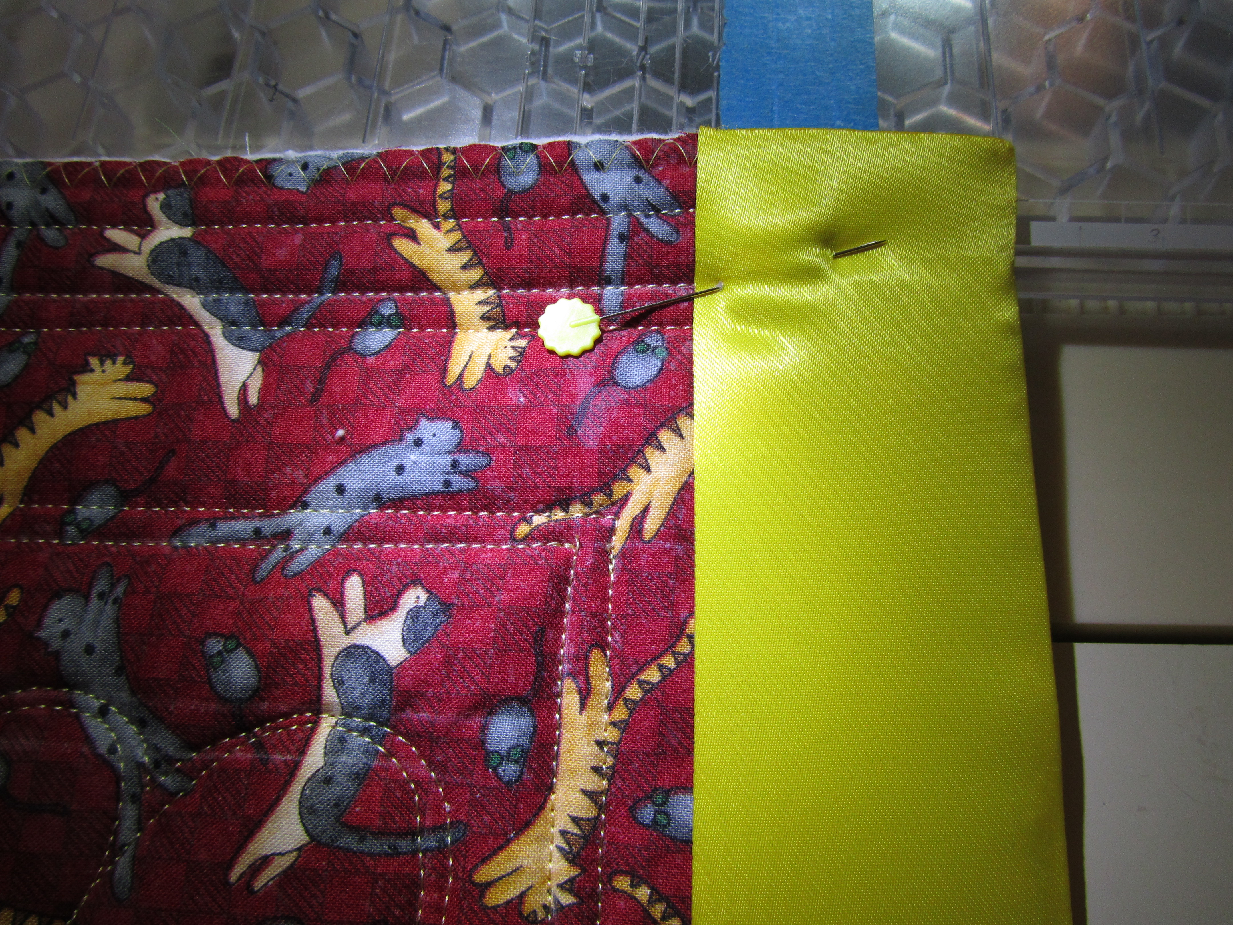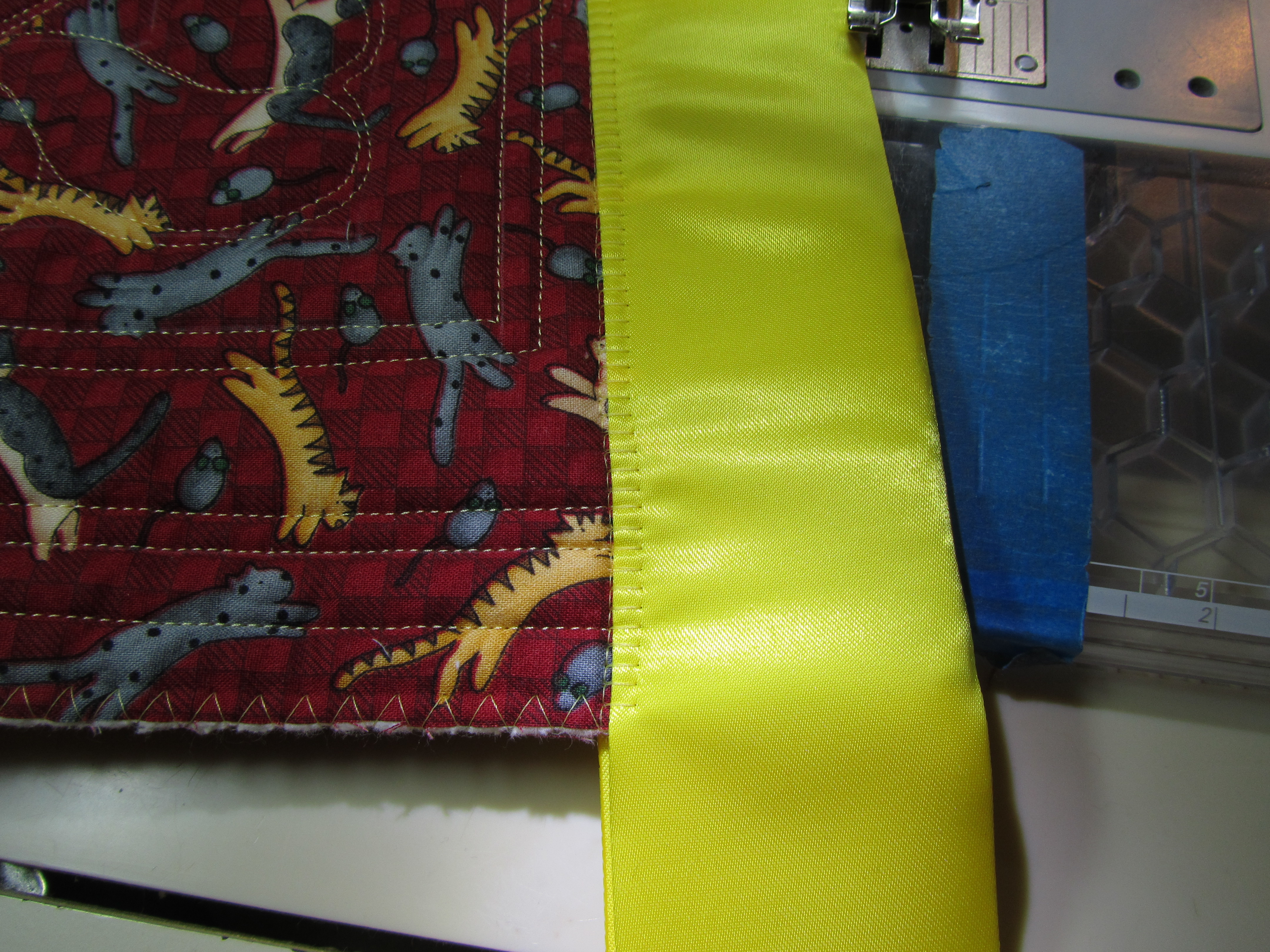 Notice how smooth and flat the yellow binding looks on my cat mat? That’s because I have not washed the mat. When I do, the mat will shrink a bit, but the binding will not, creating a slightly ruffled effect on the binding. This is just lovely on a little girl’s quilt. If you don’t want this effect, zigzag the edges of your quilt and wash it first, then bind it. I don’t think my cats will mind.