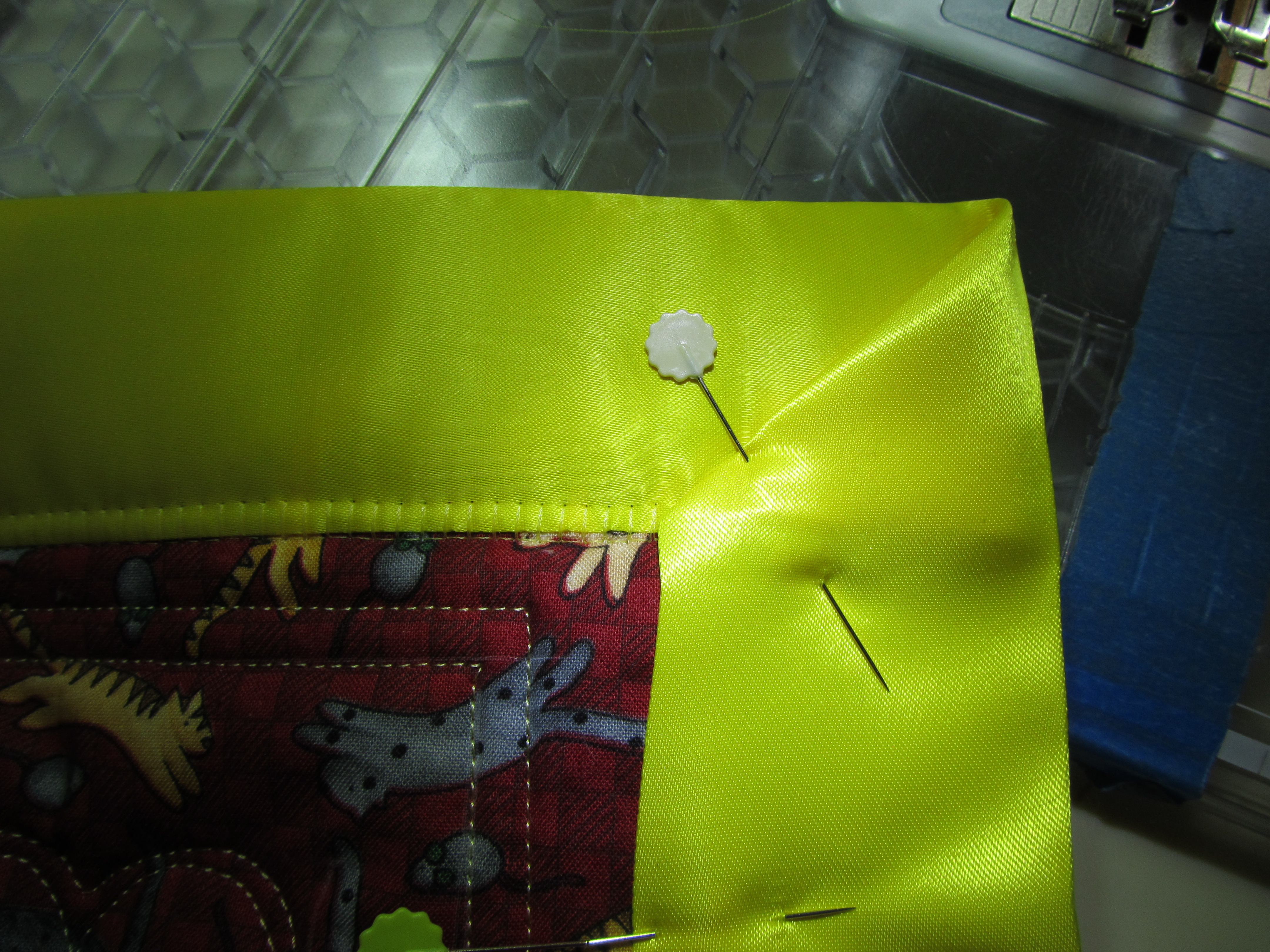 Fold the binding straight across where you have marked it. It will fight you, so you may want to press it. Then fold the corners in to form a “miter” (half miter). This takes make a few minutes and a few tries to get right. You may want to press it. I used pins to secure it. Now put the binding into place on the quilt, overlapping the binding where you began. Make sure it comes all the way to the corner, covering any raw quilt edges. If necessary, adjust the folding until it fits well. Pin securely on both sides. (This is a little bulky. I keep thinking there is a clever way to clip the extra bulk, but I have’t found it. More important to keep those raw edges under wraps.)