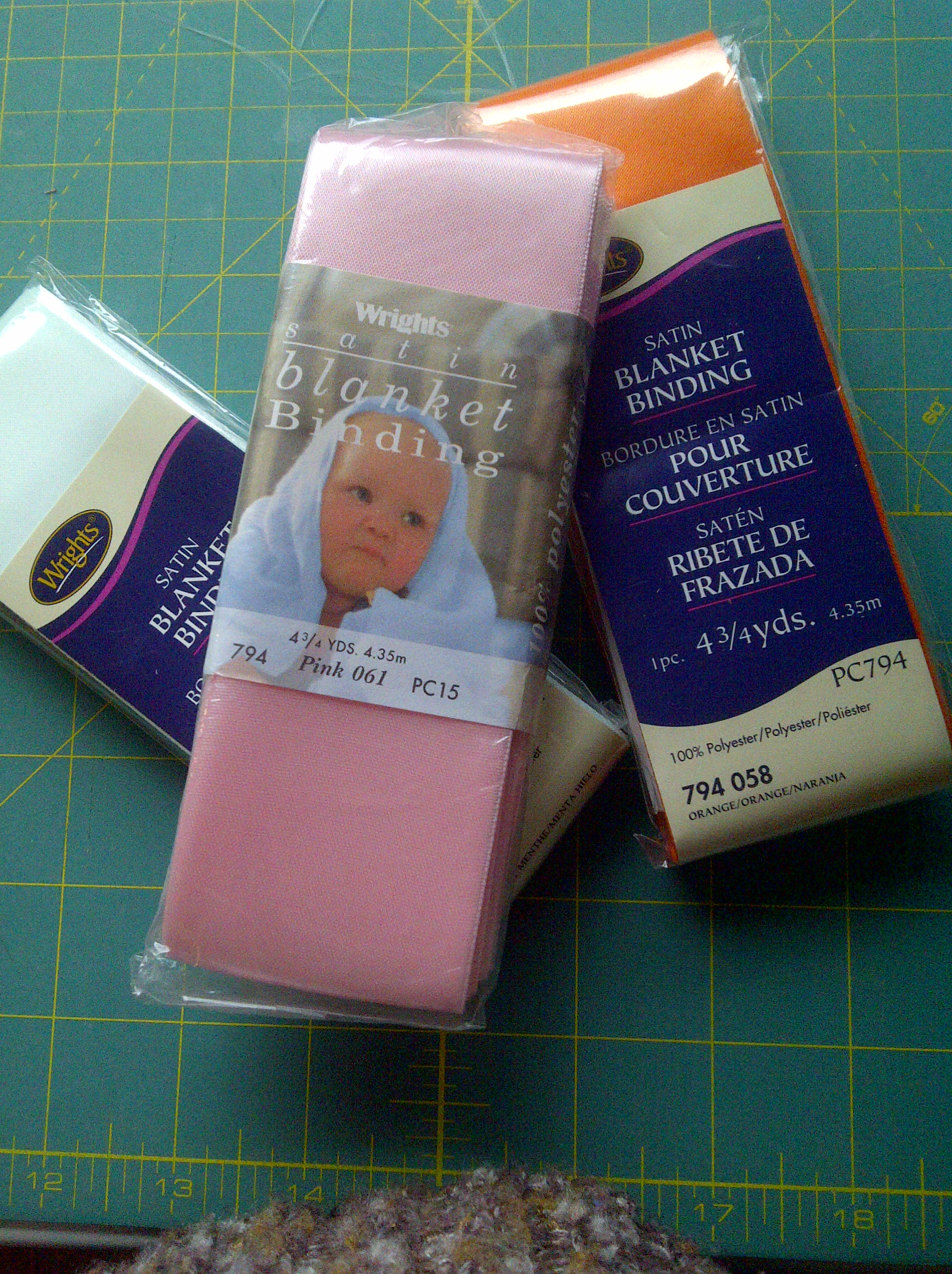 Blanket binding is nearly two inches (four inches folded in half) of solid color around your quilt. While it doesn’t have to be nearly as loud as this example, it does add a lot more color and is a much stronger design element that narrow binding. Be sure to addition your binding to make it accentuate the rest of the quilt, and be aware that there are several shades of most colors available. Wrights make several shades of pink, for instance, and I think the dye lots vary, so you should be able to find the perfect one. One package contains 4 3/4 yards, which is perfect for the size baby quilt I usually make, 36″ x 42″. If your quilt is larger, be sure both/all of your packages really match each other.