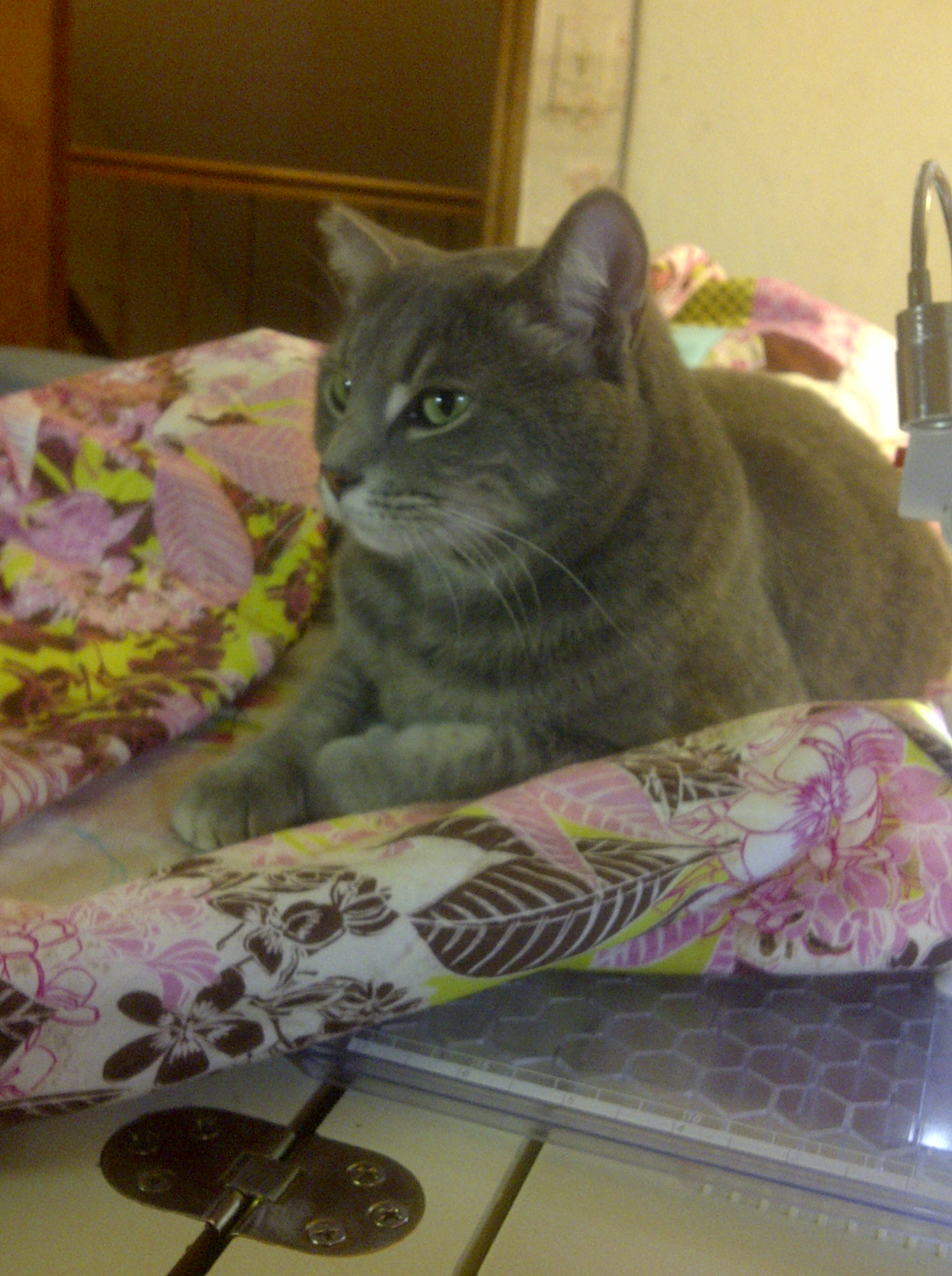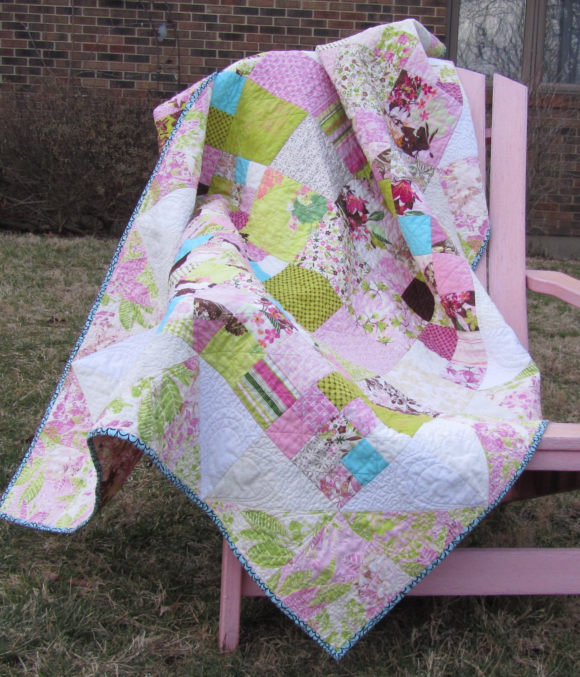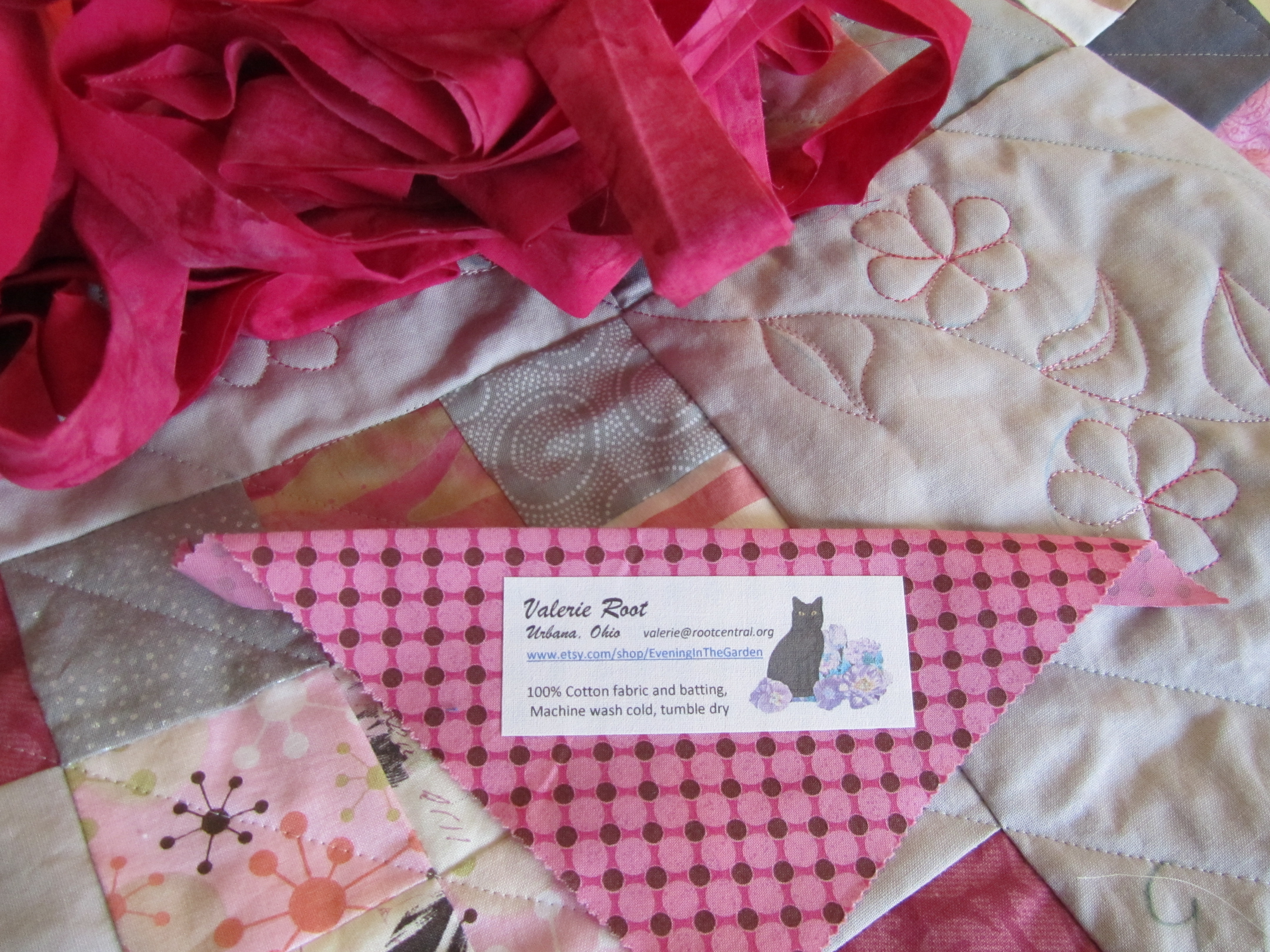 Any width binding would work, but I use 2″ strips of fabric, folded in half, sewn with a quarter inch seam, to form a narrow, tight binding. I join, press and sew the binding in the standard way (here’s a very clear Heather Bailey tutorial), except that I sew it to the back of the quilt. I’ve already basted the quilt edges during the quilting, so they are very stable. Therefore, I use a 1/4″ foot (Bernina 37) to sew on the binding. I’ve used a walking foot, and it works, but I have trouble getting a consistent 1/4″ with it. Use what works for you.