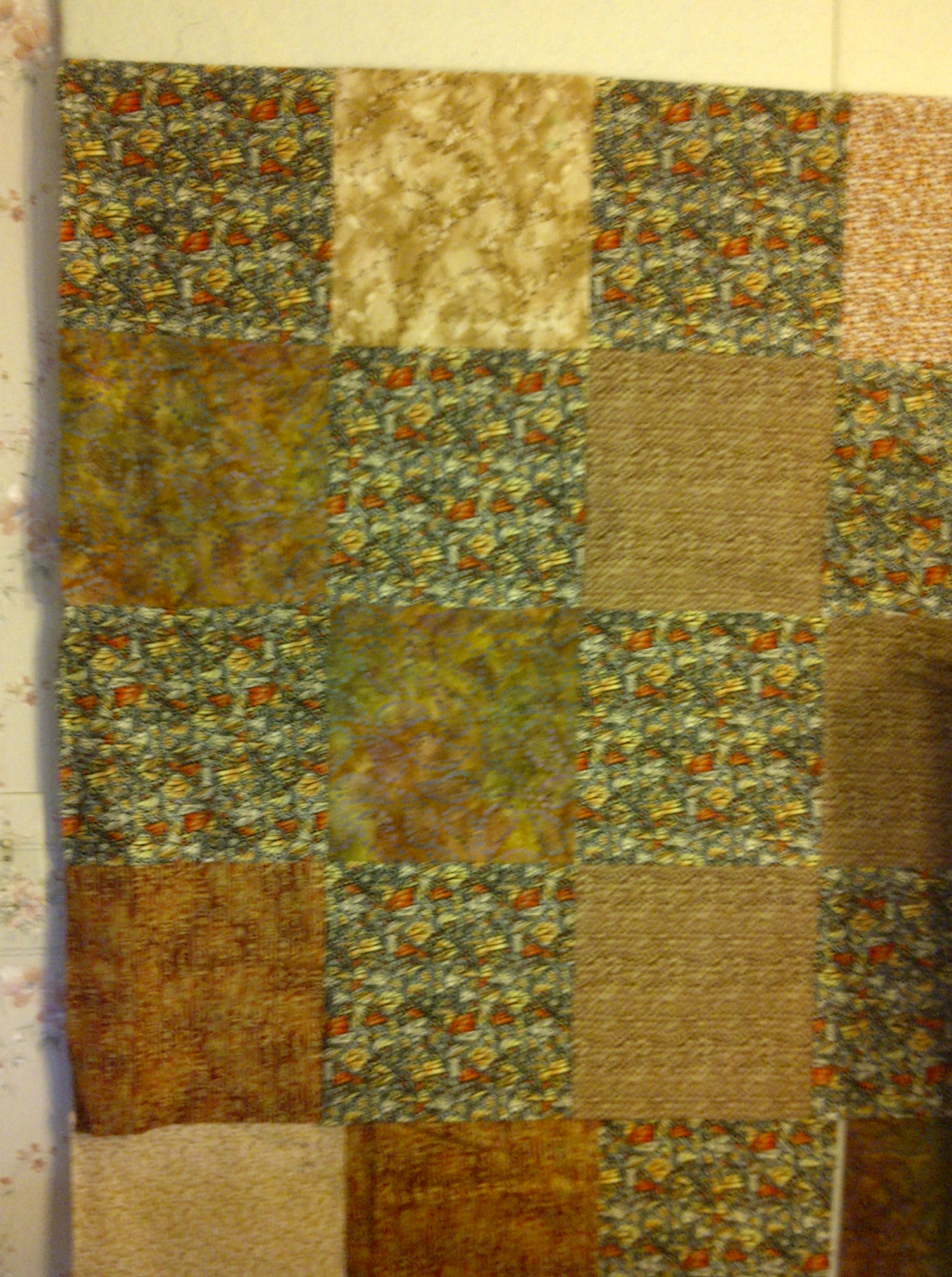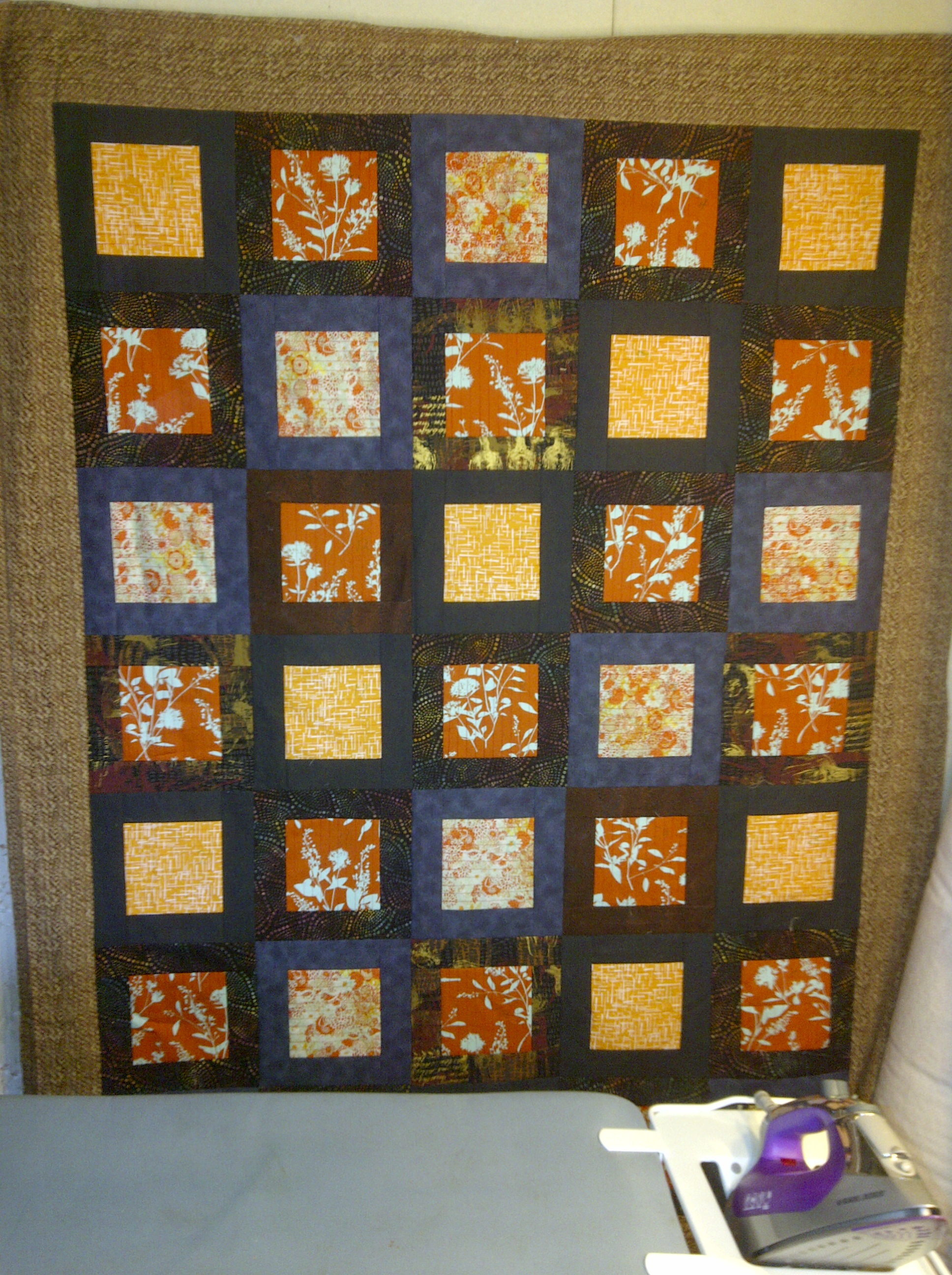 Now on the design wall is the backing. I’m piecing it from 12″ squares of varous brown prints, plus a black, white, orange print of monarch butterflies. I think it picks up on some of the oranges form the front, while still blending with the browns.