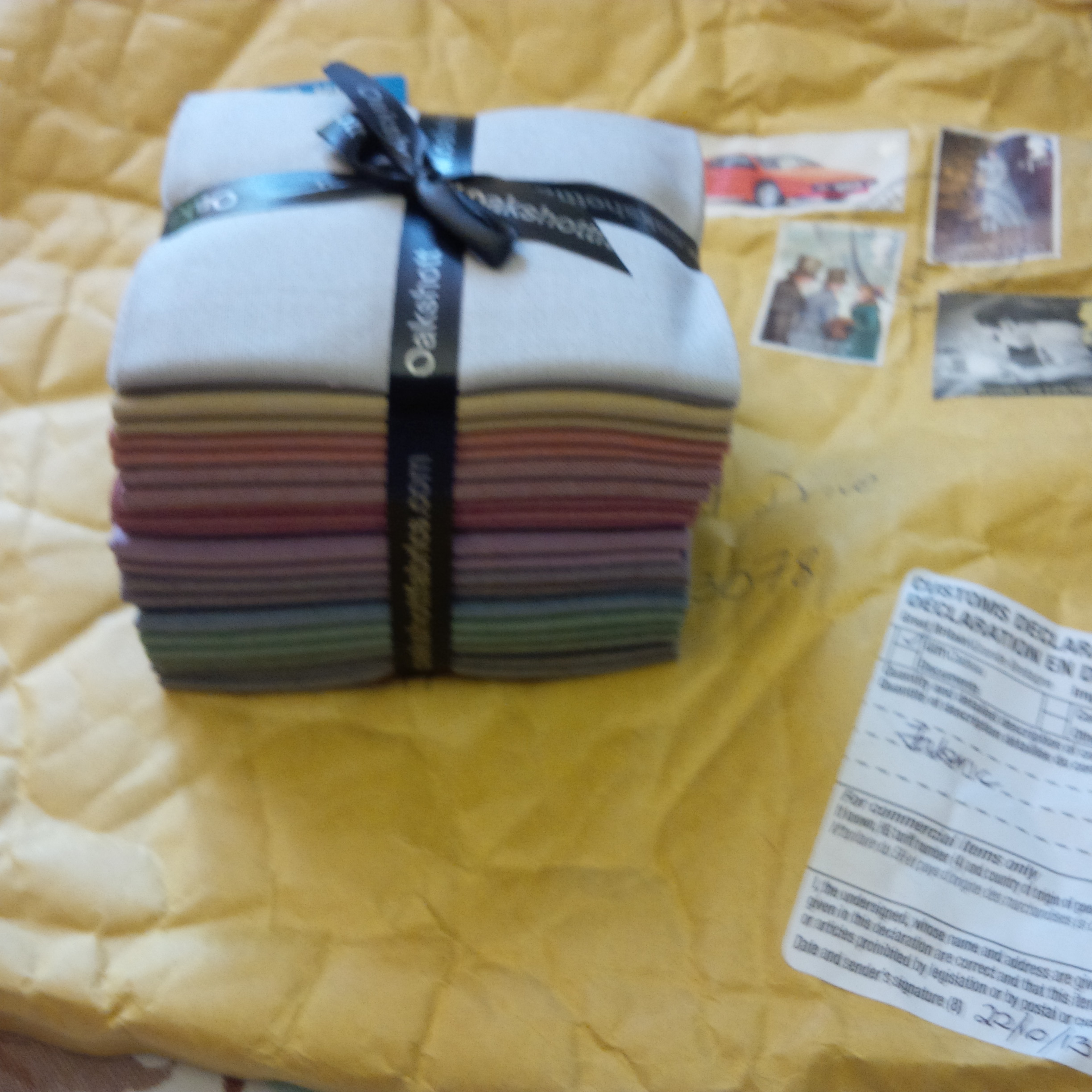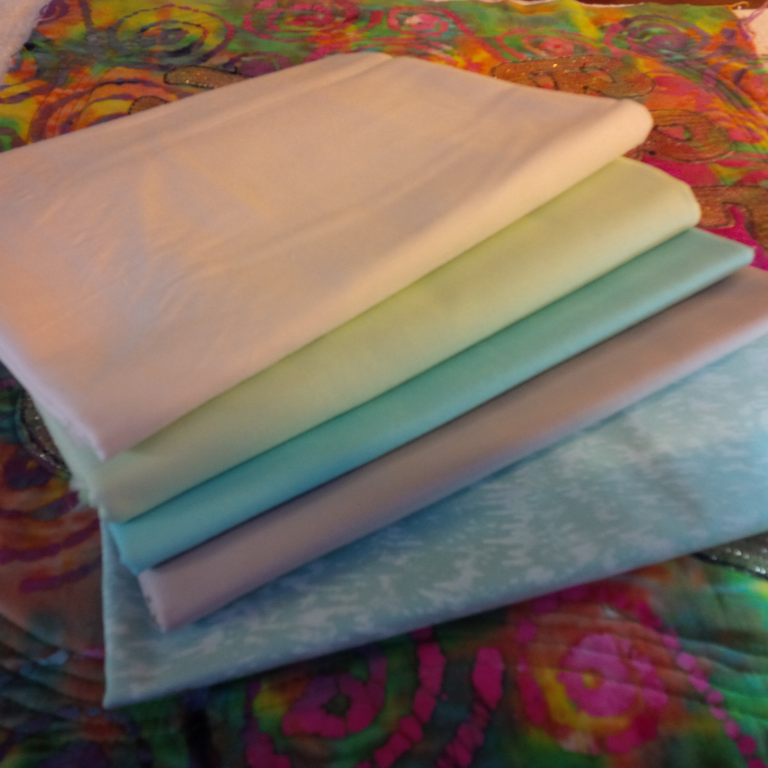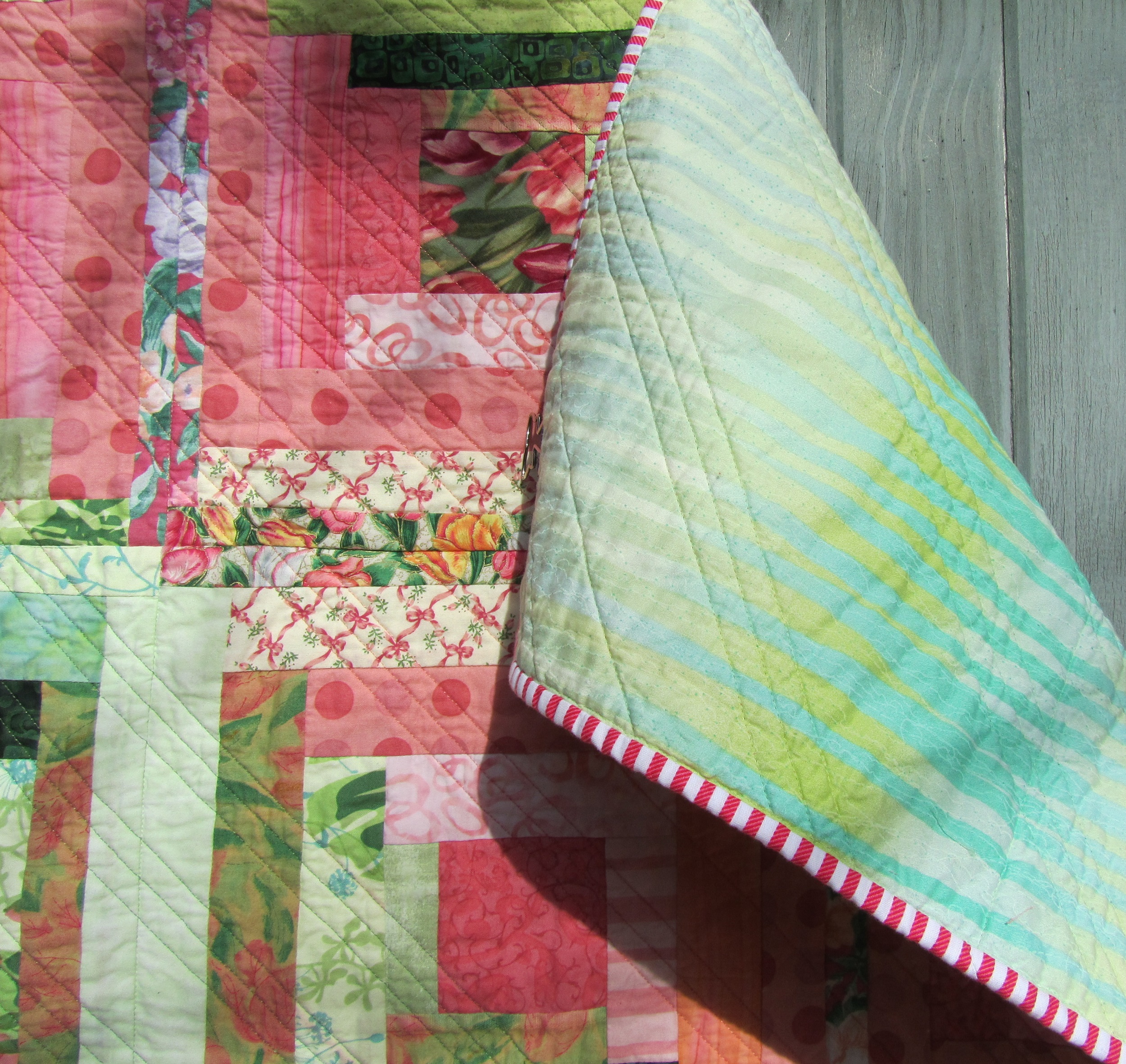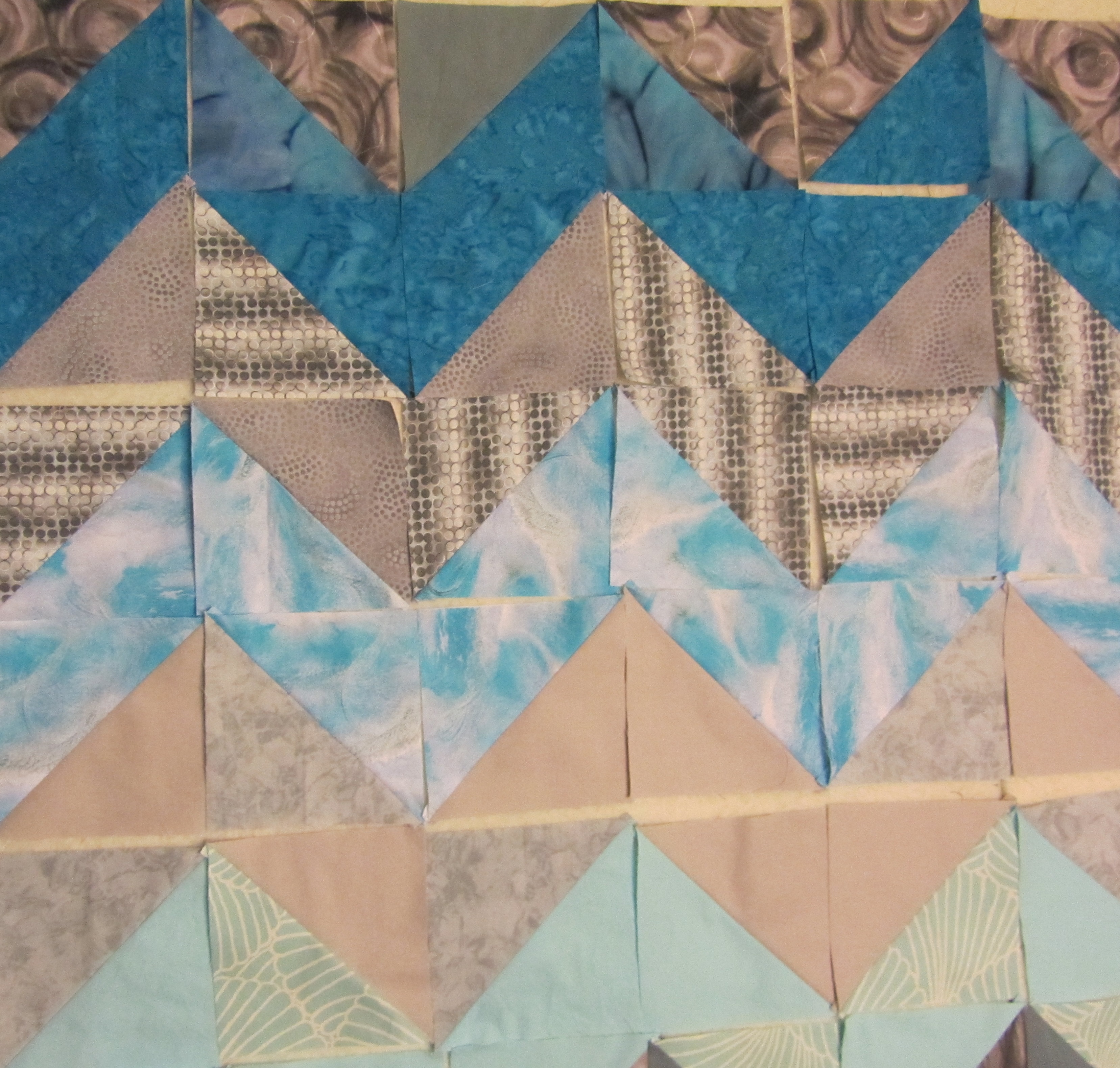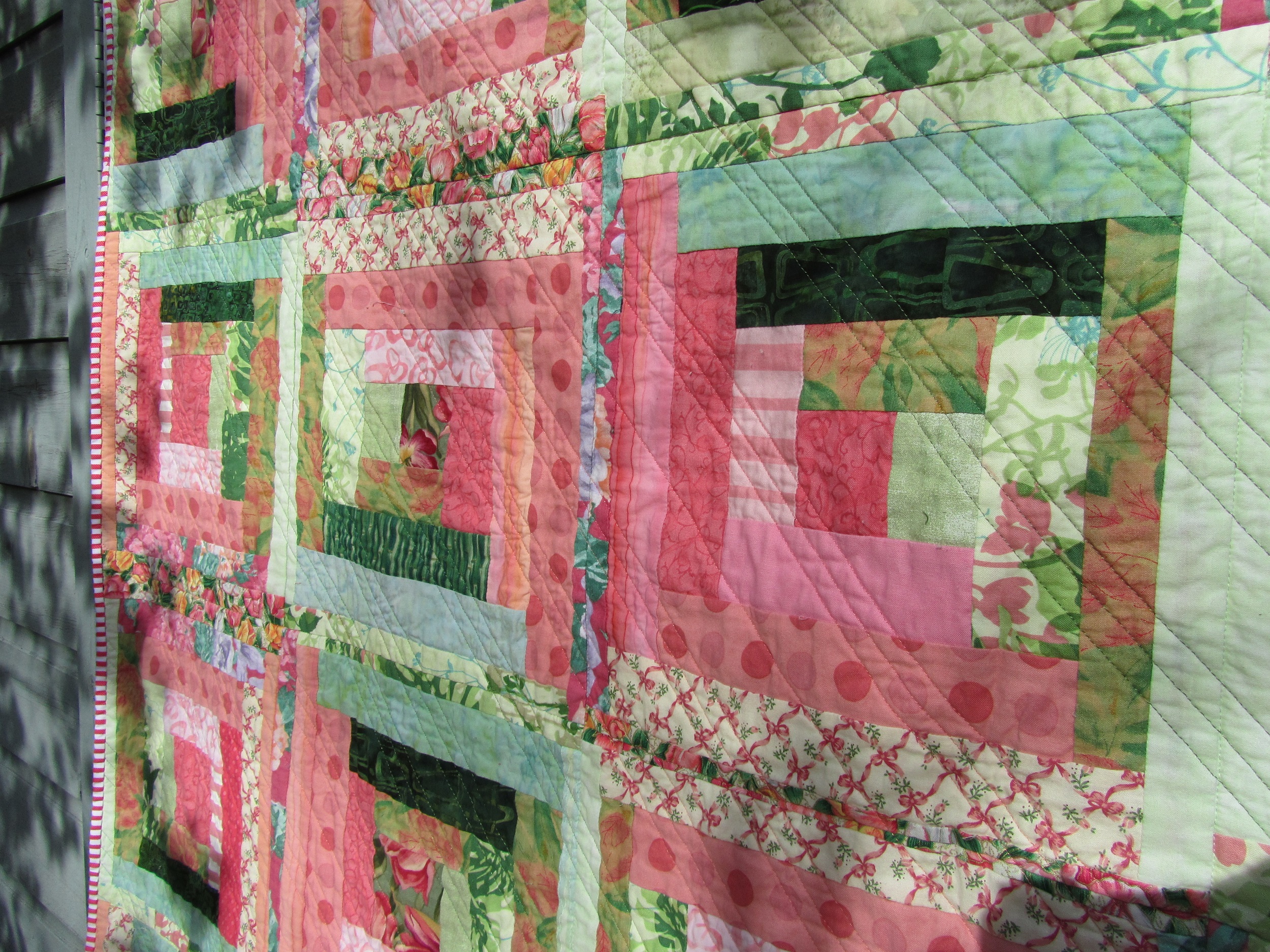 The second version had a few problems. I needed more Kona solid for the borders and to fill in the empty spaces. I like the effect of the extra space in the design. Unfortunately, when the Kona came, it was not the same color as the original. As a sometime knitter, I know all about buying enough of a dye lot for a project, but I hoped that Kaufmann had it down to a science. Also, it seemed a little thinner than the original. The difference doesn’t show much in these outdoor pictures, but under artificial light it’s pretty noticeable. Not awful. I did arrange it carefully, and hope it looks like a design decision.