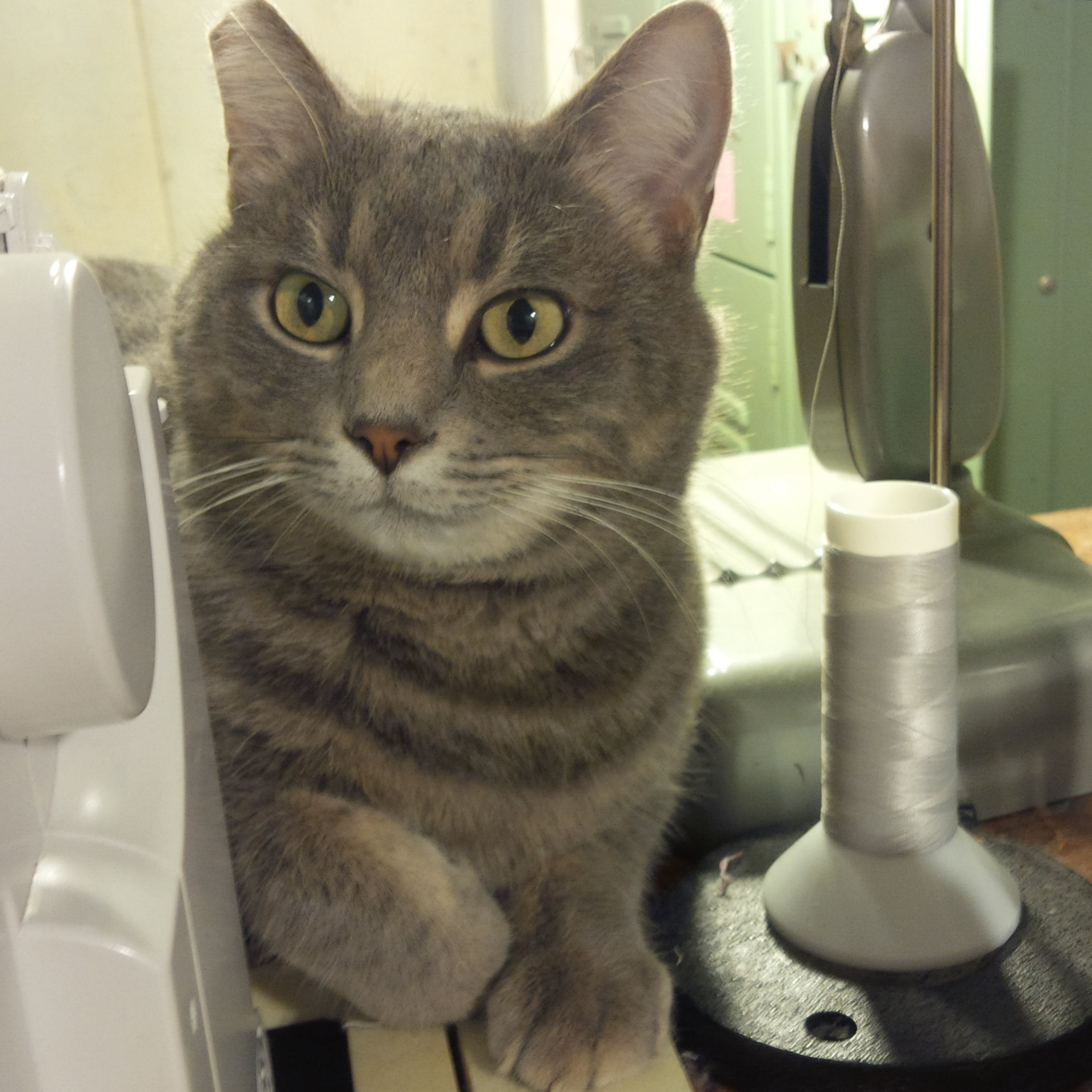 That, and Yuri’s interest in this process, didn’t make for very smooth feathers. I thought this might be a job for Sewer’s Aid lubricant, but my JoAnn had never heard of it. In desperation, I took the spool to the garage and gave it a good spray with a can of silicone showing pictures of cars and boats. Wha la! Magic! Sewed like a dream. Wish I had done it when it first started acting up.