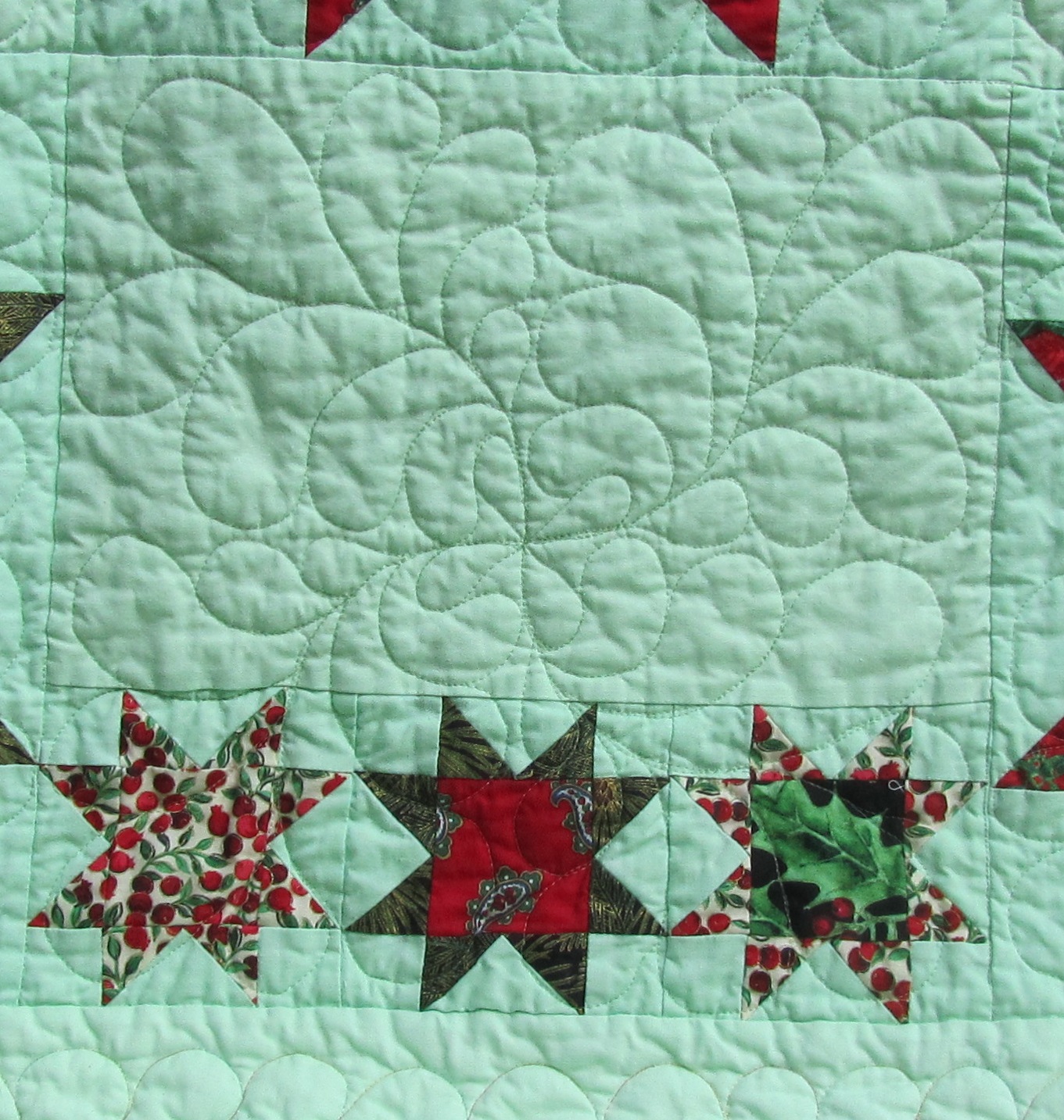 Then I made the decision to quilt the feather border using a red, green, gold metallic thread. I can’t blame Sulky for the problems I had with this. This thread is really old (and I still have a spool and a half!), and seems to have sort of formed to the spool. My machine does very well with all kinds of threads, and I did a test first and had no issues. The thread didn’t behave too badly for the spine and first side of the feather border. It seemed like the farther I got into the spool, the worse it got. It stuck to itself and seemed rough in the machine. I found that if I manually pulled off a few lengths of thread first, I could sew a few feathers, but there was still breakage.