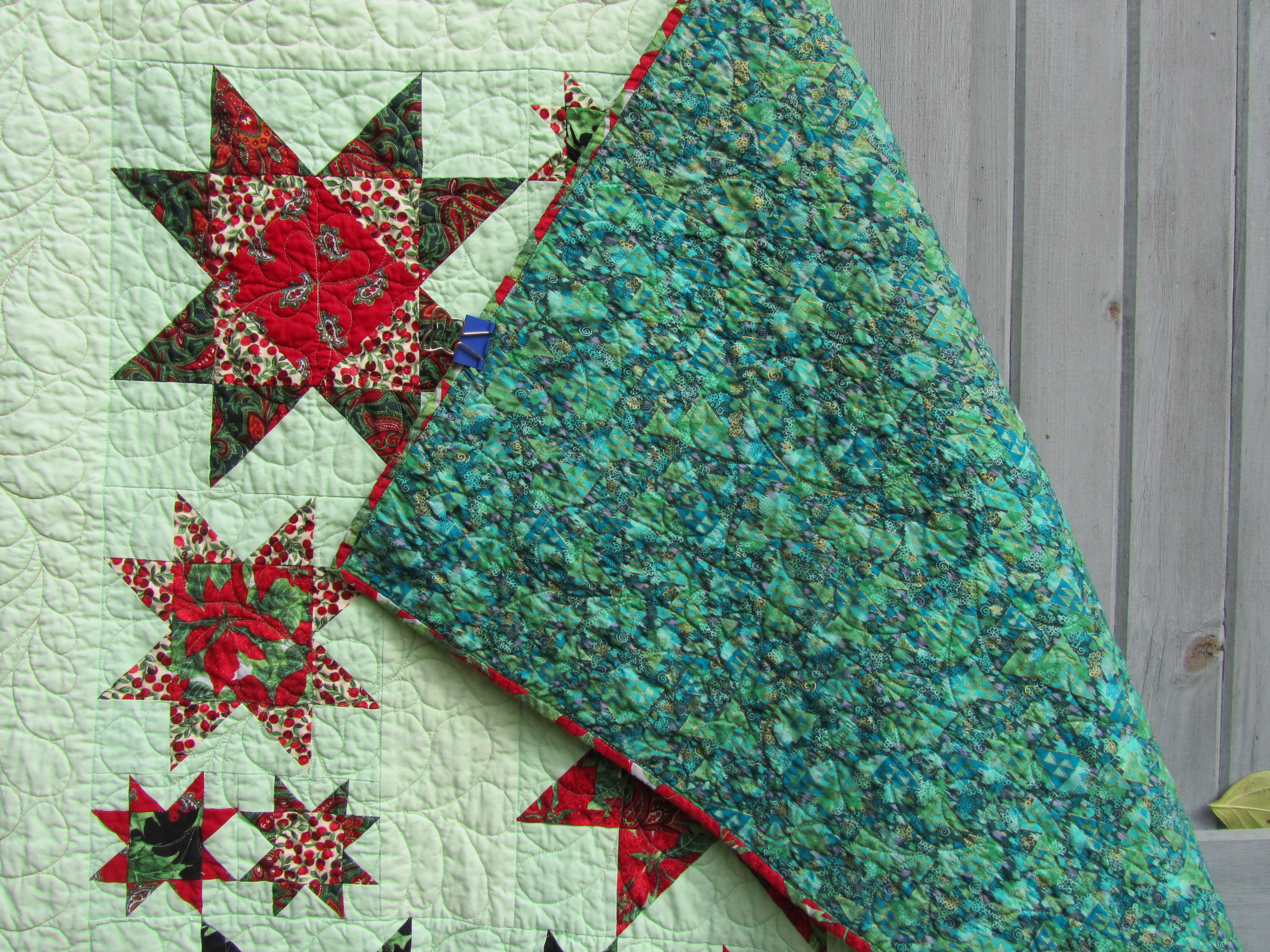 The backing for both quilts is a busy green print from my mom’s stash. I had in mind all this time that it had stylized Christmas trees on it, but they’re just triangles. Looks good, anyway.