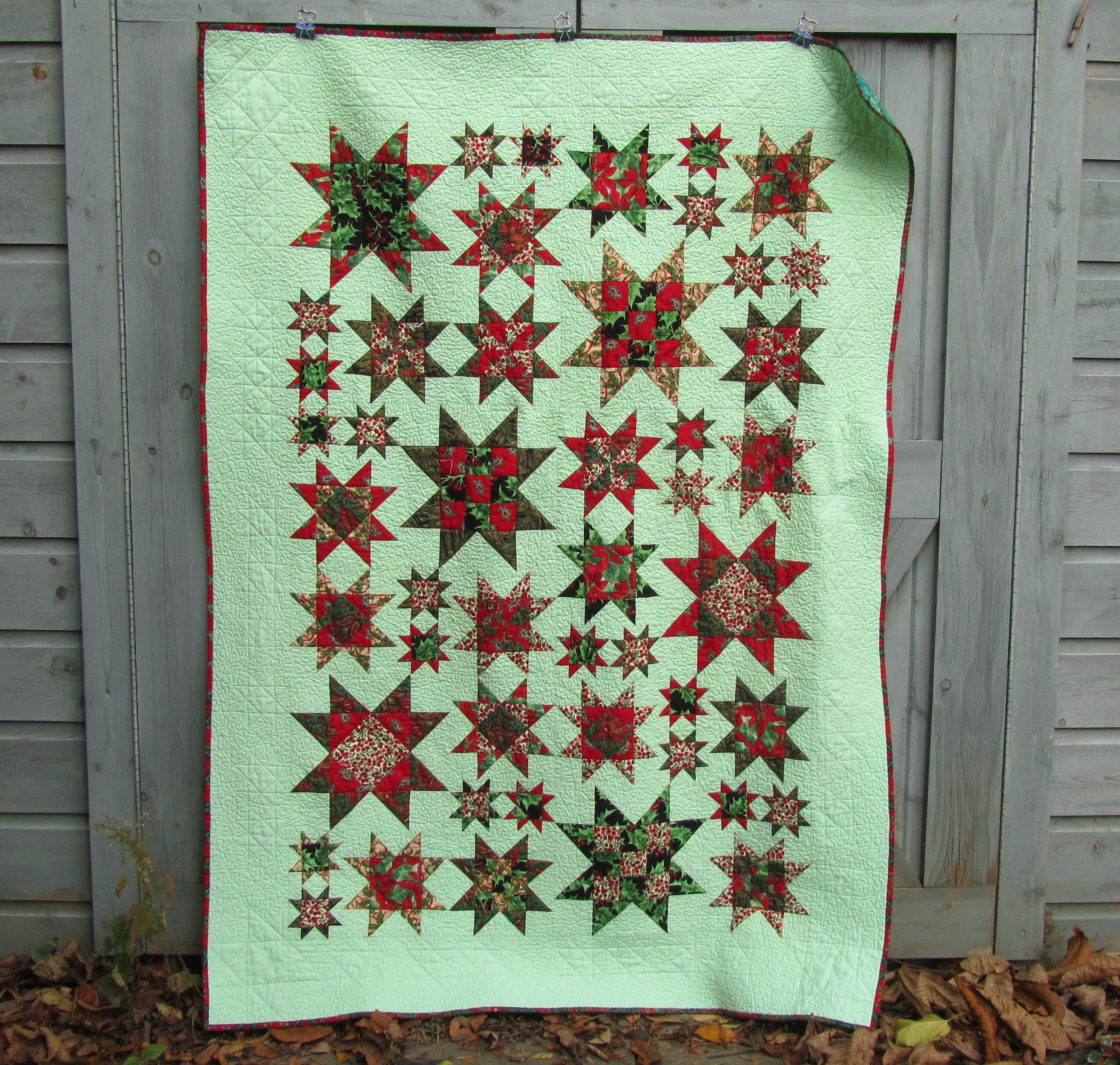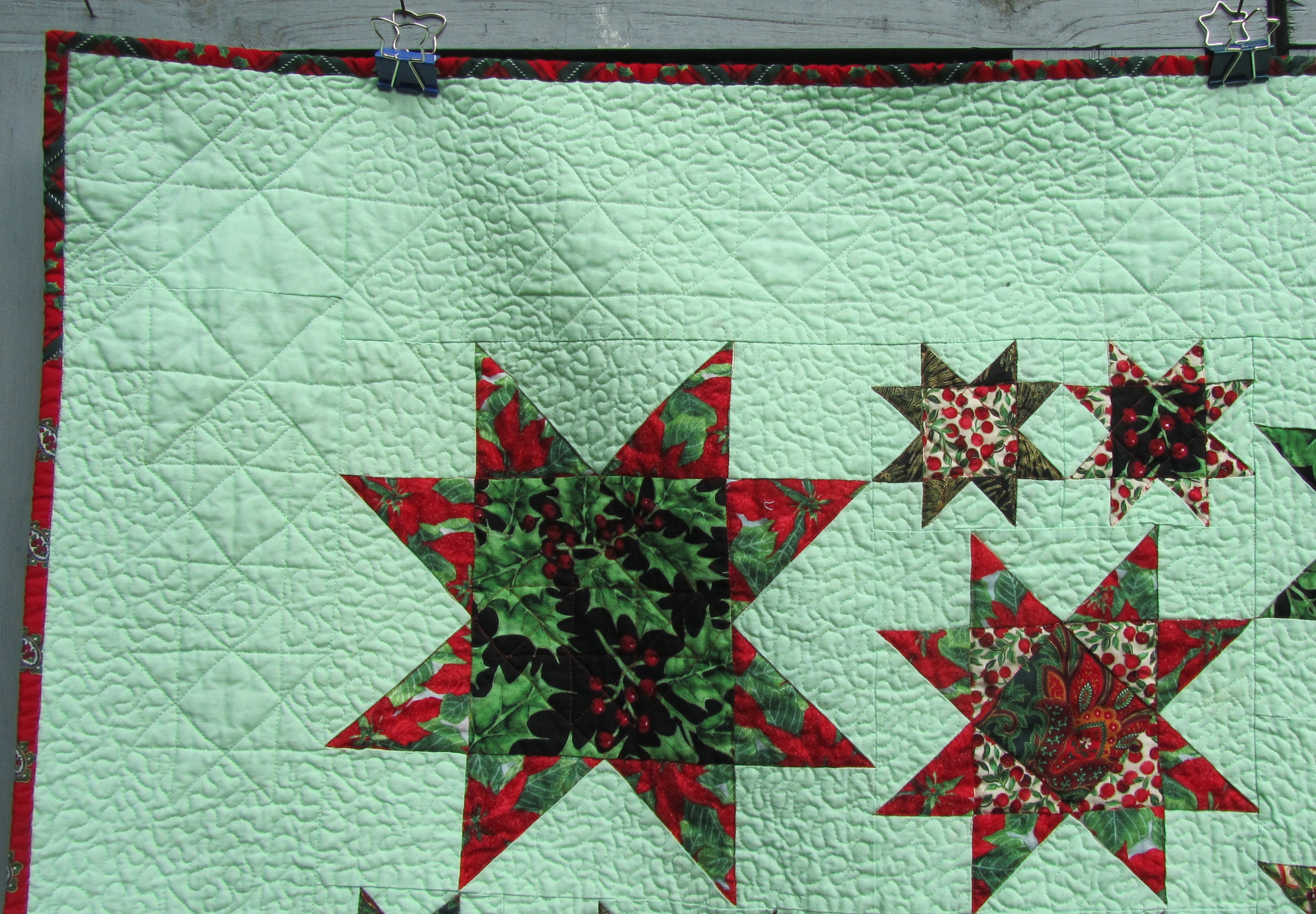 Here is the first of my two finishes from this project. I love the fabrics and the minty green background (Kona “Mint”!). This one has lots of crinkly texture from all the stippling. I don’t have too many UFOs, but this one has been nagging me, and I’m glad it’s finished, and in time for Christmas.
