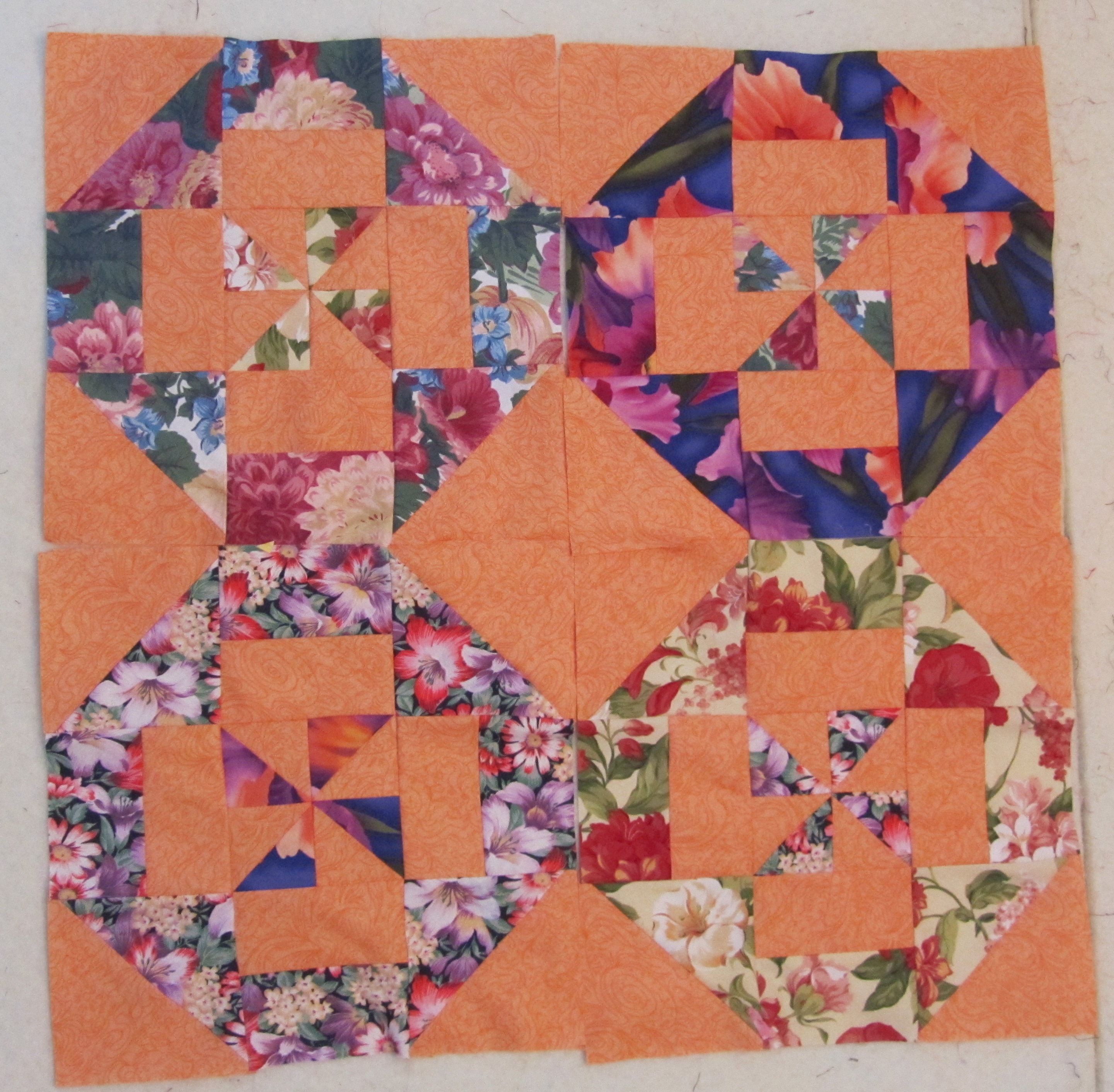 On Martin Luther King, Jr. Day, many of us on Twitter made our own versions of the Disappearing Pinwheel quilt from the Missouri Star Quilt Company, here and here.  I’m using large scale florals, and switching out the centers.  The background doesn’t photograph very well, but it’s a light peach, toward the orange side.  I’ve completed a dozen blocks, and it won’t take long to finish the rest.  I’m not completely sure what I want to do with it, but it has been fun to work on with folks from all around the world.  Here are a few photos, and it’s worth checking back to see more.  Our fabrics choices are very different!