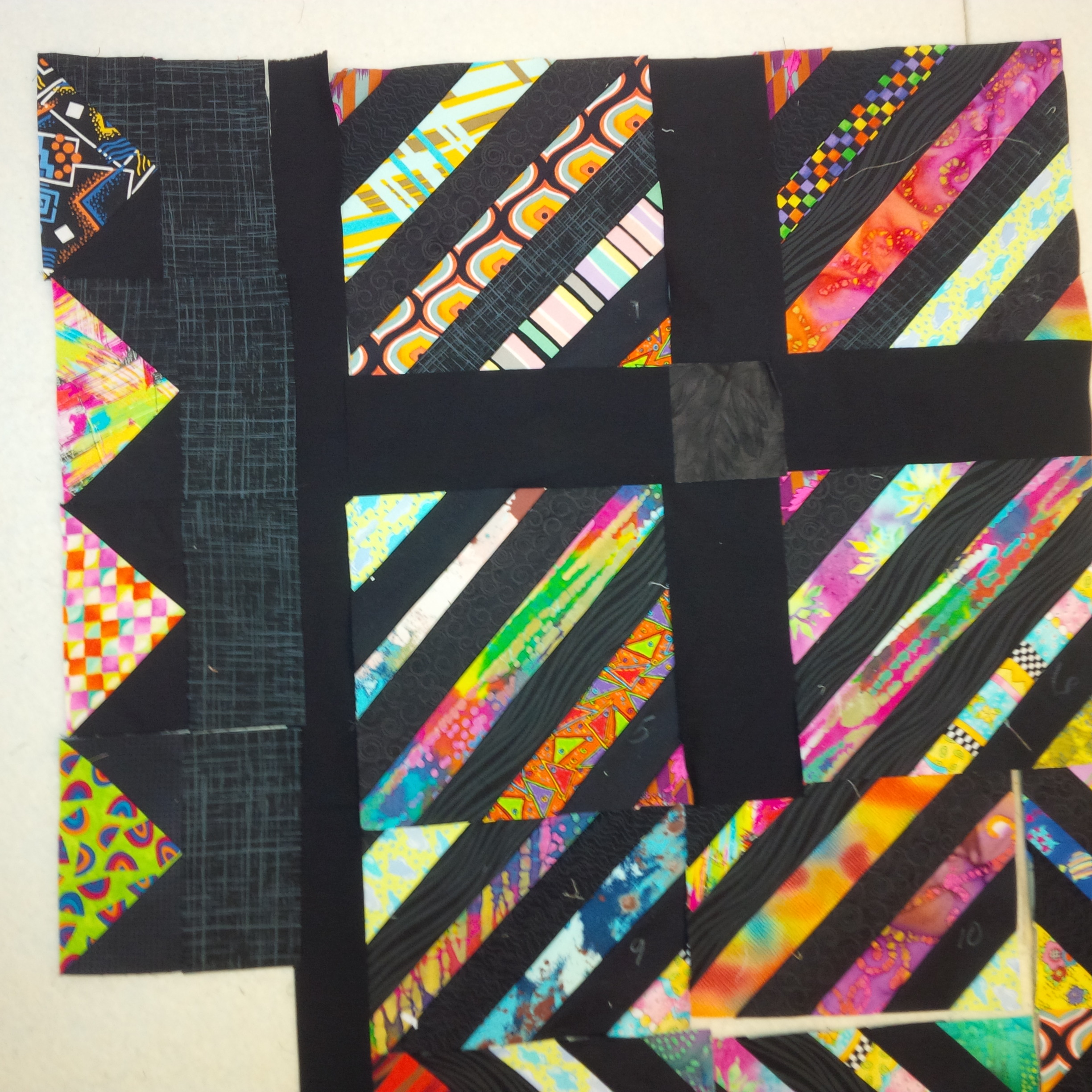I still love color, but not quite as saturated as these prints.  This wasn’t a planned slow quilt, but each design decision along the way led to another.  I set the bright strings off with 2″ strips of black prints and black Kona solid.  I’m really happy with the visual interest from the black prints.  Then I sashed it with black Kona.   It was beginning to resemble a vintage crazy quilt.  Then the border needed to be black, but not all black, so I pieced in these bright triangles from scraps I had set aside for another project.