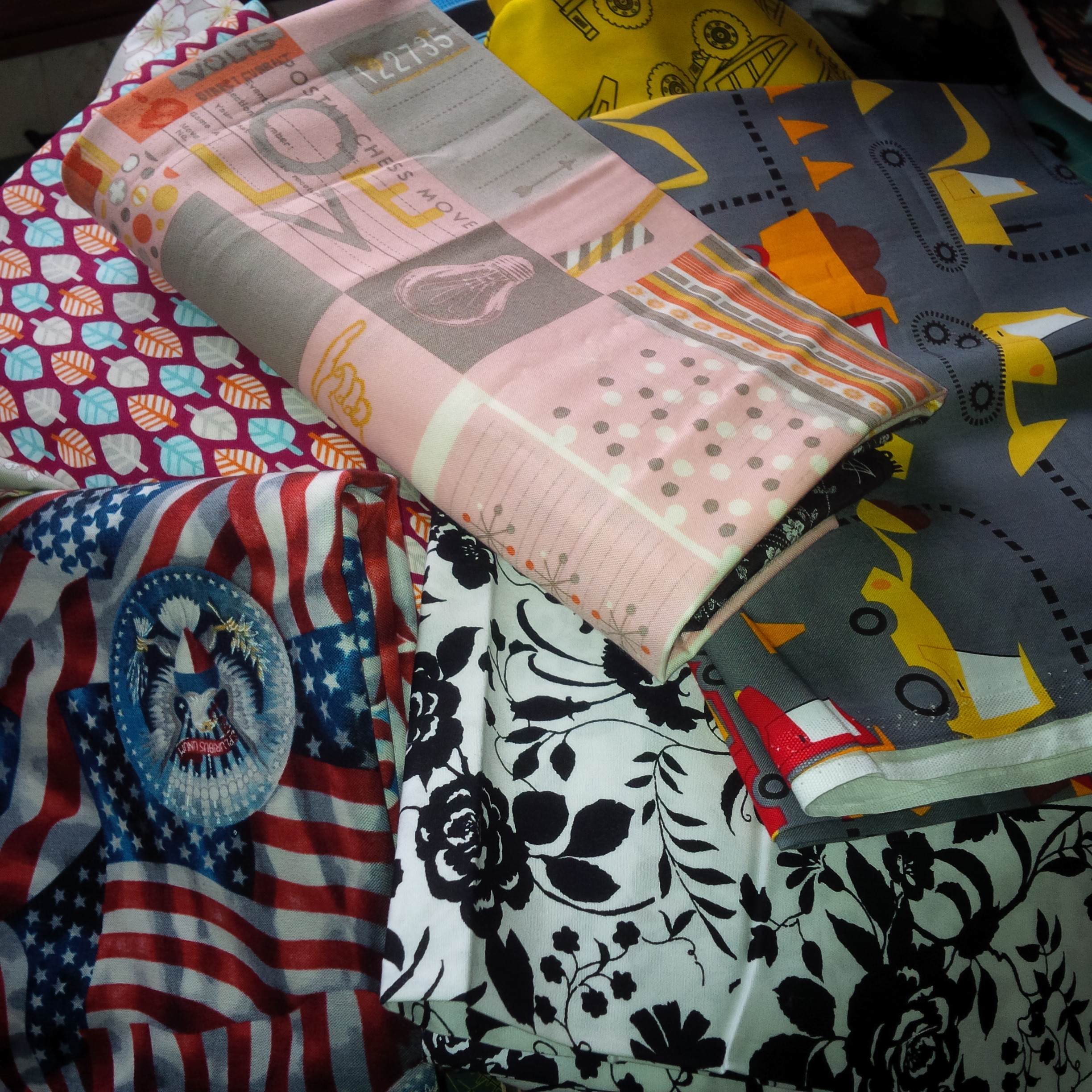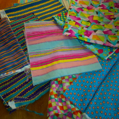Now I’m looking at fabrics for the back.  I don’t have four yards of anything remotely coordinating, but I do have all these brights, so I think I’ll cut them into large squares and piece them together. Which may procuce more bright strings, and I’ll be right back where I started…hmmm.