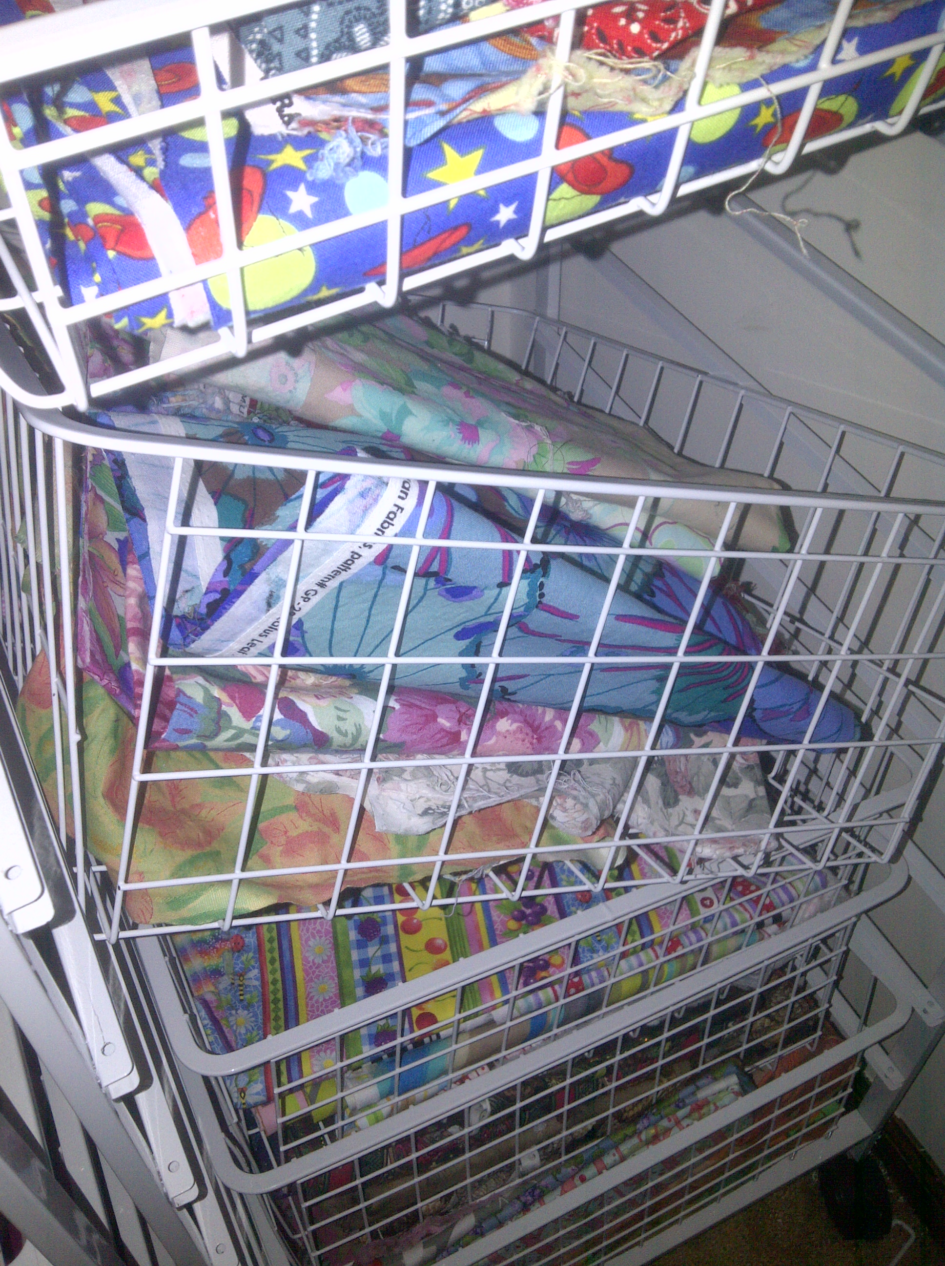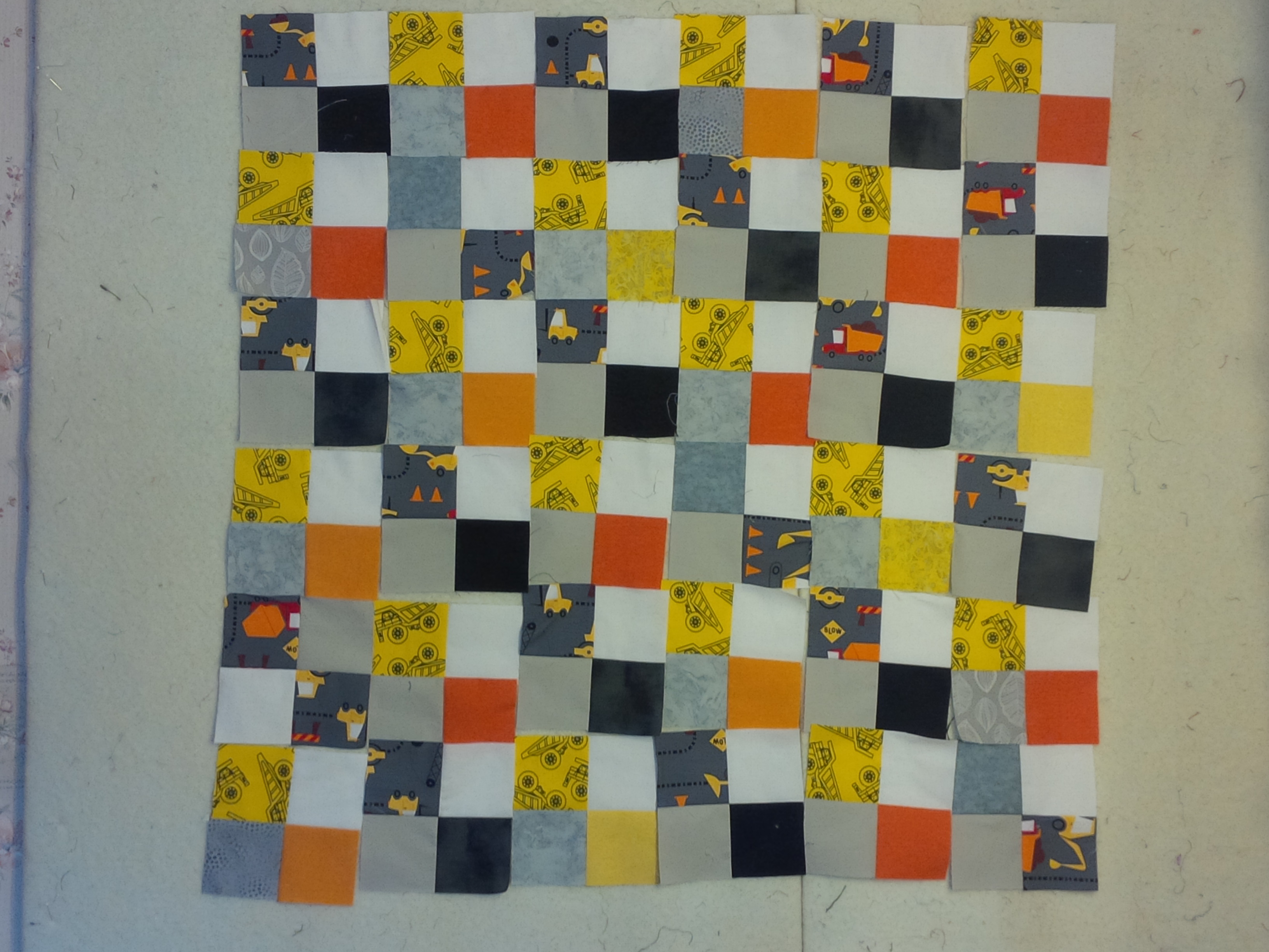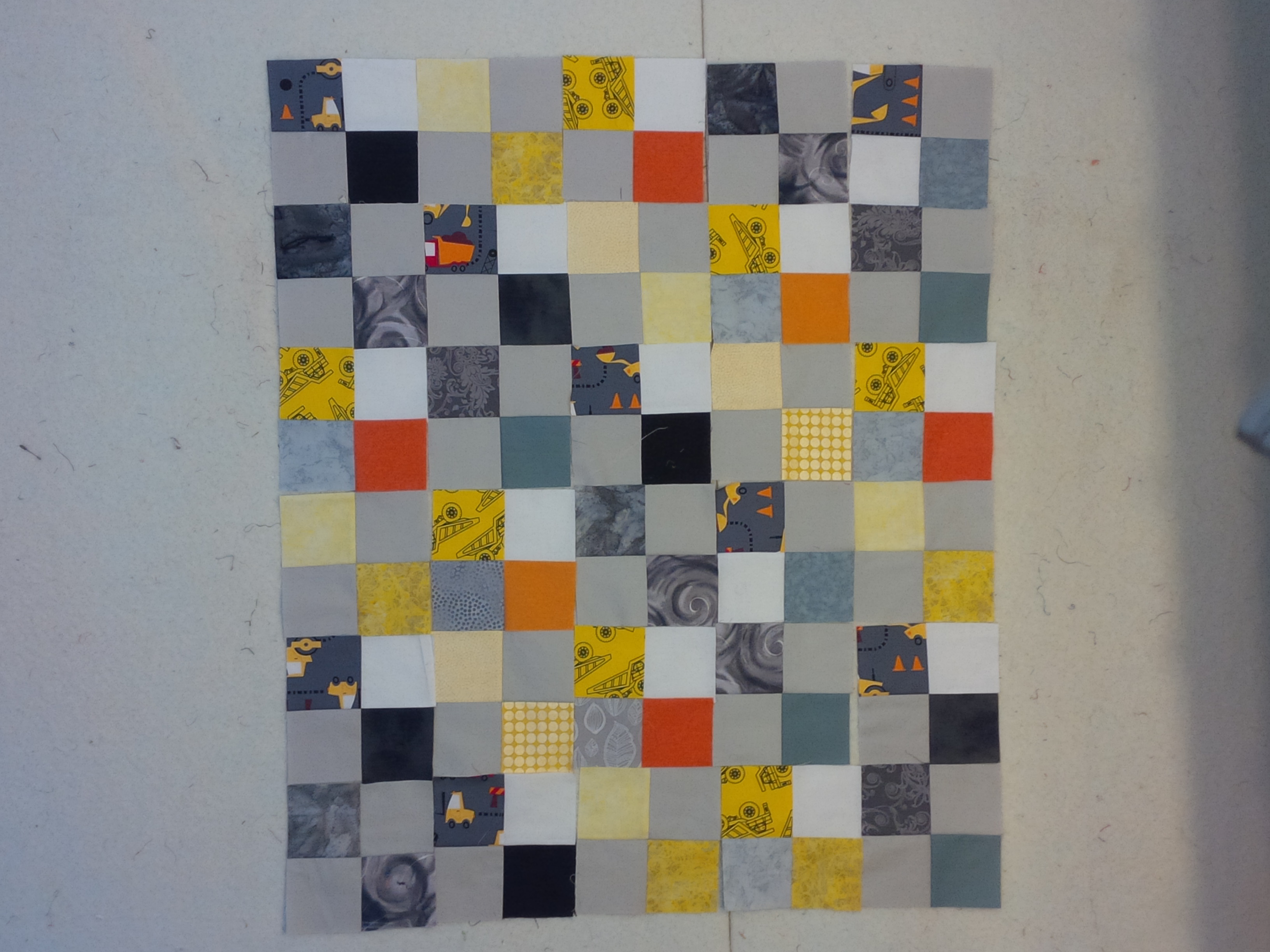 The Stash this week: Nothing in and nothing out. I felt like I had a finish when I completed the gray and yellow top (140 3″ squares), but I won’t count it until I quilt it. Good news: I found the perfect backing for it on sale at Fabric Shack. Bad news: It wasn’t the only thing I ordered. This new biweekly fabric ordering needs to stop, but I needed some navy for a commission…Yeah.