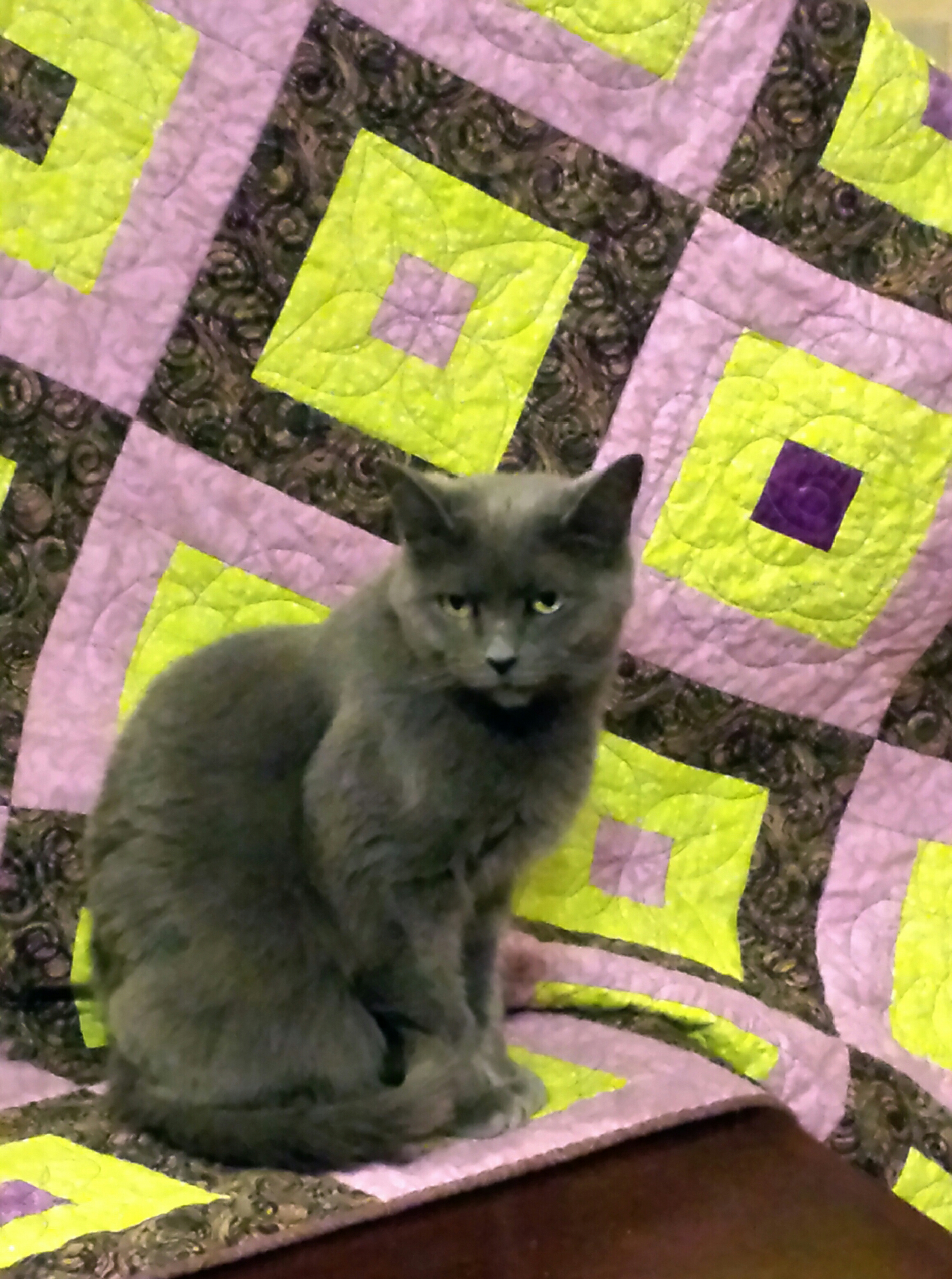 Sewing has happened this week, and no fabric buying!  I did have to order a new roll of batting, but that just helps use the fabric.  I used two yards for a customer’s wall hanging, and seven and a half for another purple and green quilt, this time for donation (Krissi is modeling it).  If you missed the post on Spring Violets, it’s here.