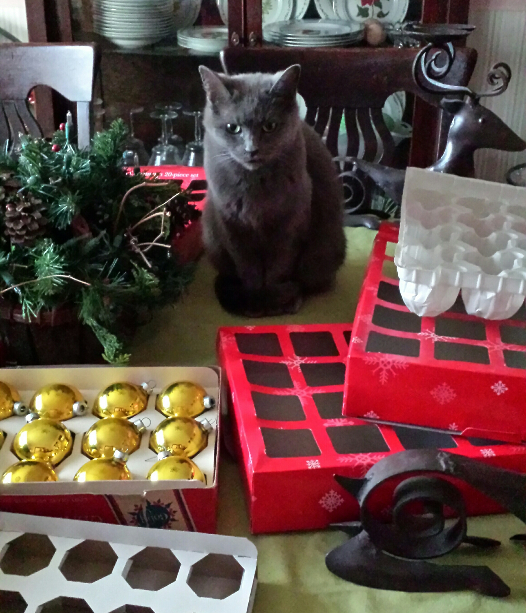 Here’s a Christmas puzzler for you. See if you can spot the cat who’s not allowed on the table. You’ll have to look very closely, she’s sure that sitting perfectly still and avoiding eye contact makes her invisible. Right.