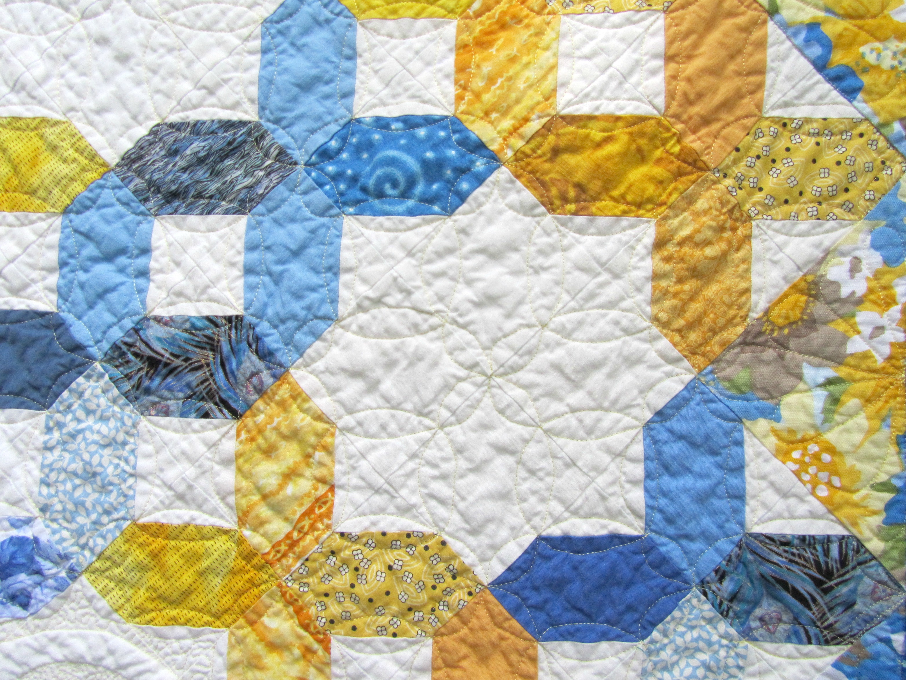 I quilted it all with yellow Sulky on top and white Bottom Line on the back. Most of it is done in an orange peel motif [probably never again after all the terrible puns (redundant?) on Twitter!]. Those are butterflies in the centers of some of the white areas. I would do them differently another time, but they are not bad.