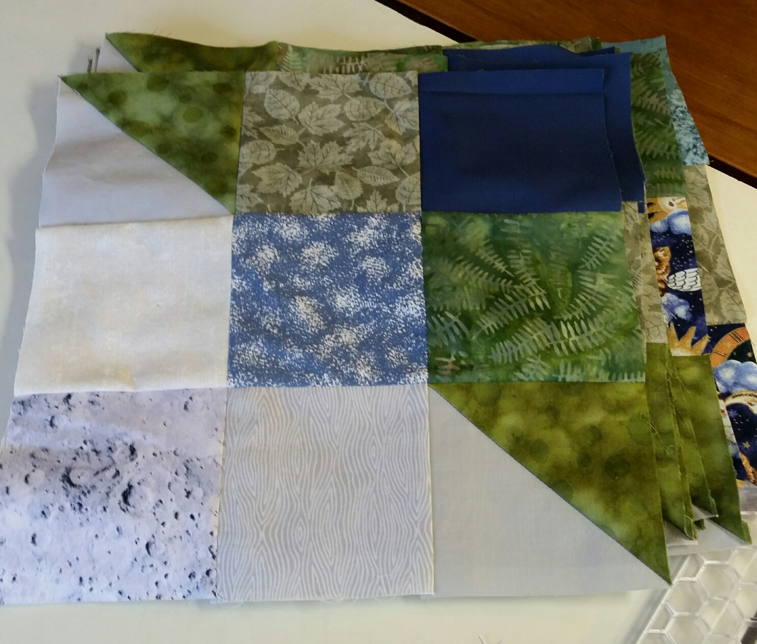 Complete the second clue for Charlotte’sScrappy Stars Around the Corner. Yes!Continue Gyleen’sBricks, Cobblestones, and Pebblesmystery quilt. Yes!- Unpack fabric lockers and get help moving them over a foot. This will help with locker and floor access and make it easier to vacuum. Well, no. I did unload the lockers and attempt to move them, but they’re heavy and on carpet, so I gave up. Instead, I moved a lamp in the way, and the roll of batting. I also tidied up my cords, and changed the sewing machine so it wasn’t plugged into the same outlet as my iron (bad for the computer). And I vacuumed and dusted.