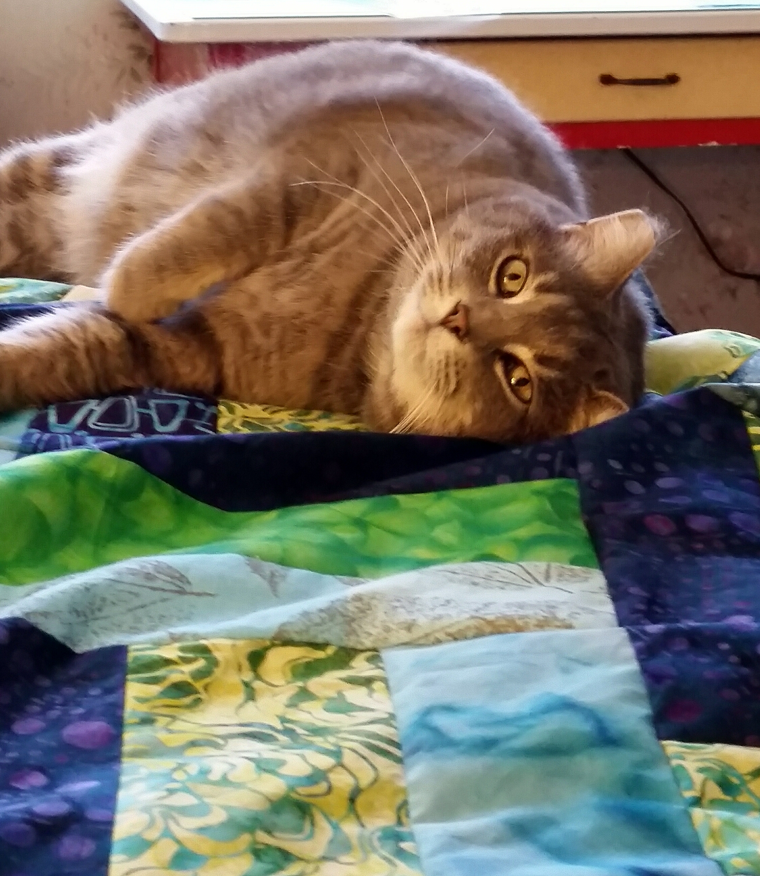 Yuri and I finished up this rail fence quilt yesterday. Here he is admiring some of our wavy quilting lines.