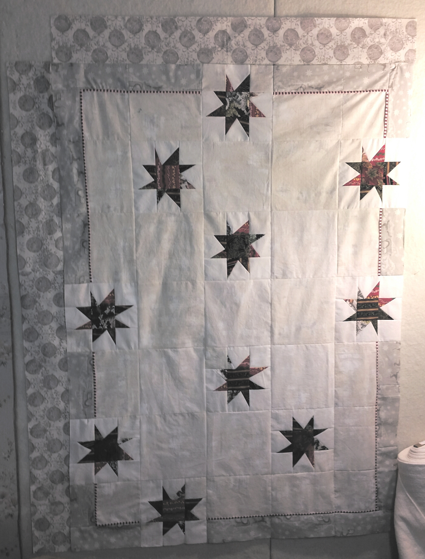 I have been making lots of progress on quilting Christmas Stars. I only have two borders left to quilt. I’d say I would finish it this week, but I’ll be traveling most of the week to visit my husband’s family.