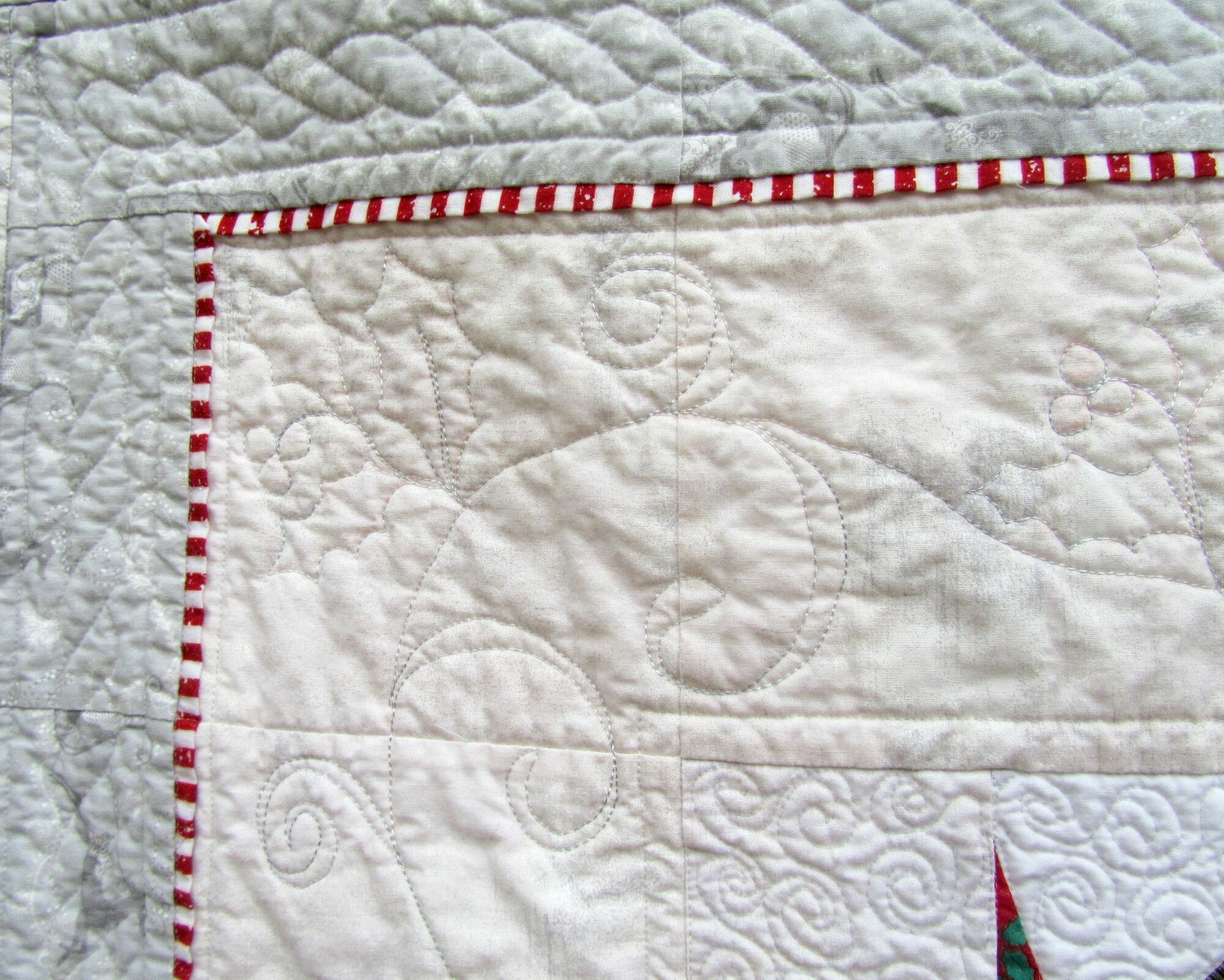 I quilted between all the blocks first with the walking foot and fine thread, so they have more quilting than might appear. On one I quilted straight lines through the leaves and feathers through the blank spaces, edge to edge.