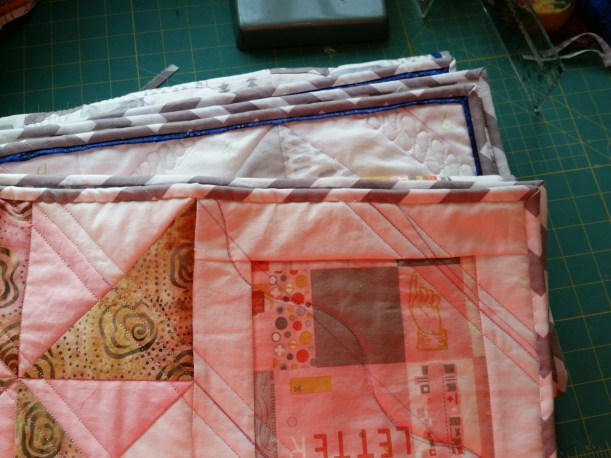 The batting is Warm and Plush. It really is nice and plush-y, and fine for quilting. One drawback is that it shrinks more than the regular Warm battings. I put minimal quilting in the version of Pink Pinwheels that I made for Etsy, and it shrank two inches in each direction, which wasn’t a problem, since it was a little large anyway. I made an effort to add more quilting to these two (roughly every inch or two inches), and it shrank 1.5 inches in each direction (on a 36″ x 42″ quilt). It is nice and poofy, just be aware.