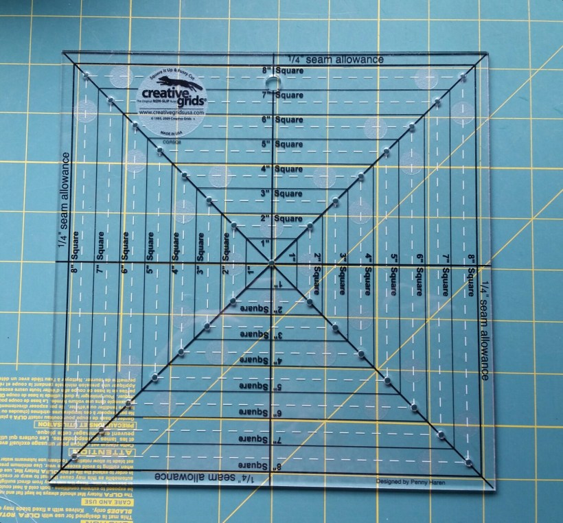 These are 7.5″ blocks, and I don’t have a 7.5″ ruler.  I do have this nifty Creative Grids Squaring Up and Fussy Cutting Ruler.  I went online to see how to use it, and also found out that I have the prehistoric version.  The new ones are printed with a bar code to view on your phone and go directly to the YouTube instructions.  Huh.