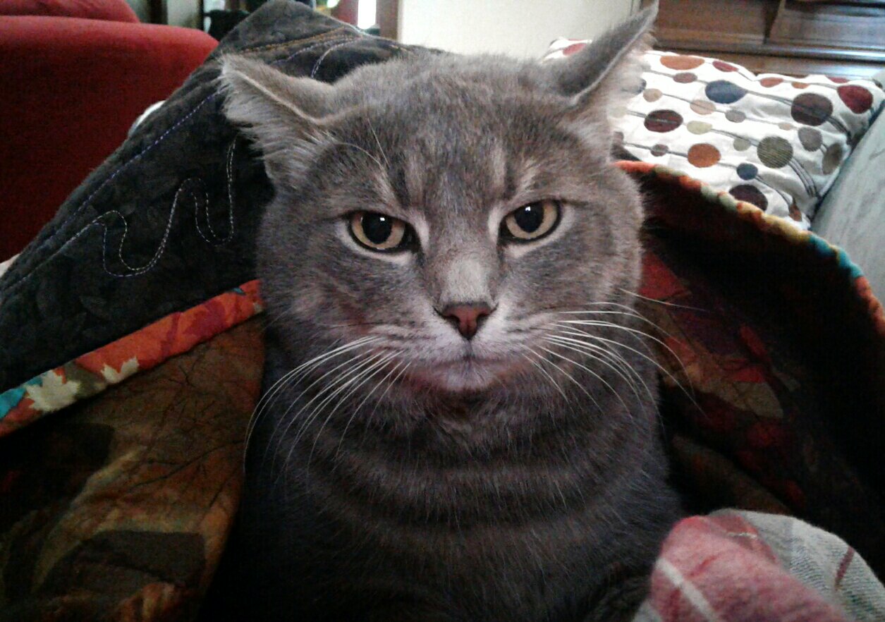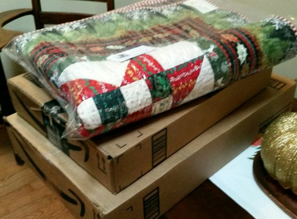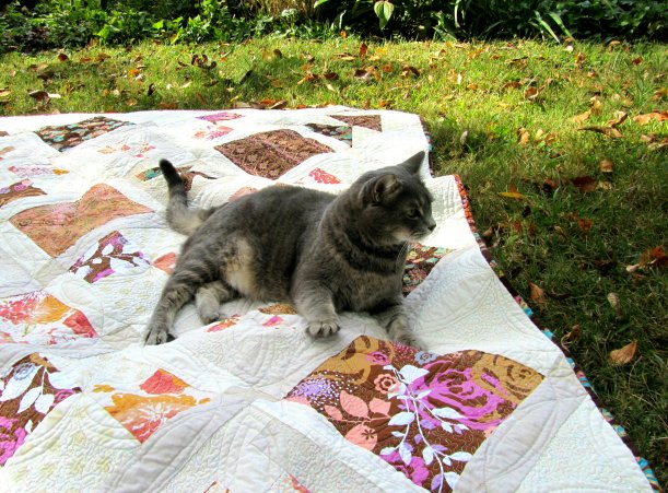 Because I used wider sashing, my quilt measured a whopping 93″ square, which was tough to cram under the machine. In a moment of particular lunacy, I thought how nice it would look with a double batting…but I quickly regained my sense, and went with just one layer (Pellon’s Nature’s Touch 80/20). This is a new batting to me, and it was fine, but didn’t seem a lot different from the Warm cotton I usually use. I did like the careful way it was folded in the package, which made it very easy to trim and position the large batting. Yes, it would have looked wonderful with double or extra puffy batting, but it’s just fine this way. Yuri checked.