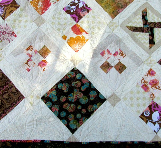 By including the sashing with each block, I was trying to quilt 11″ circles, just impossible to control on this bulky quilt. I knew that, but I wanted to try and I’m glad I did. Some of it is imperfect, especially near the center, but I still like the interlocking circles.