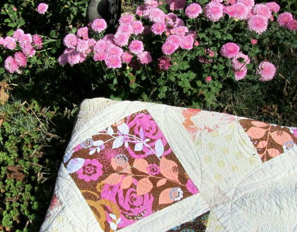 For once I feel like I did a good job designing the quilting. I was influenced by Wild Quilting by Christina Cameli, which I watched on the free Craftsy day. No, I didn’t do improv quilting like she did, but I got her message of echoing things to give them depth. So where I would usually have made one Orange Peel motif in a block, I echoed each twice. I also added a line to each of the border circles. All the quilting on the top is Superior Rainbows 9808, Opal) and the bottom is pink Bottom Line.