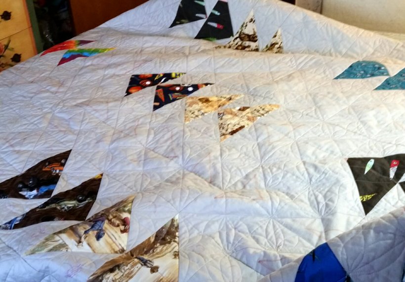 After pushing hard for a few days, I’ve finished quilting the flying geese quilt.