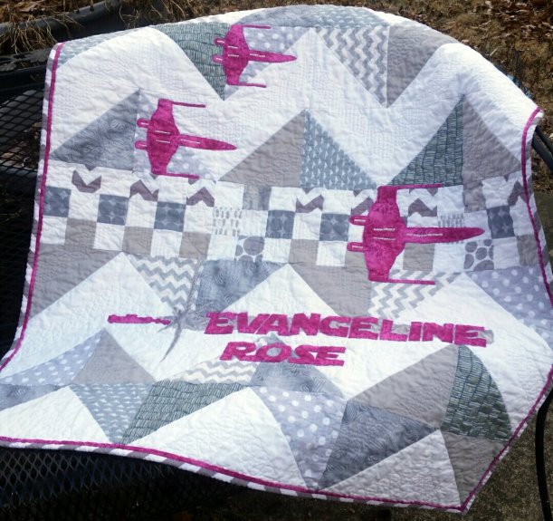 This week I finished the other commissioned baby quilt I was working on. This was special because I had made one for her older sister, accented in purple, and now grandma has ordered this in, well, rose. Then we went to see The Last Jedi last night, and I kept thinking, “Those are x-wings! I’ve appliqued those a lot lately!”