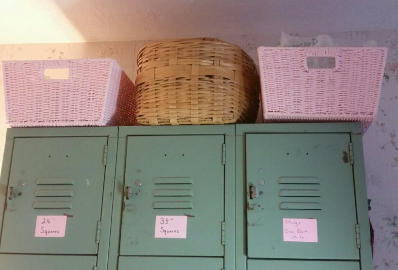 My old webbing baskets on top of my lockers literally disintegrated this winter. I hope it was sun damage from before we installed the current windows that are supposed to protect against uv rays. I shopped my basement for the center basket and Hobby Lobby for the pink ones. One holds a mystery quilt in progress, one has leaders and enders kits, and one has extra shipping supplies.