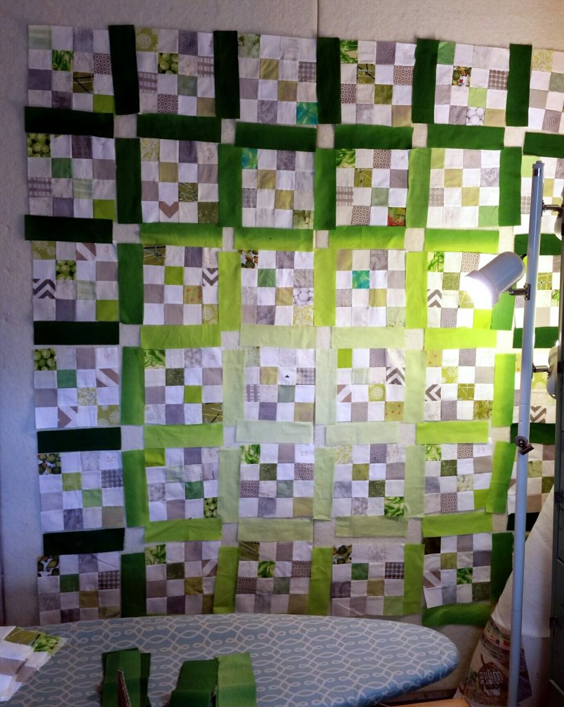 Now I’m working on setting these leader-and-enders blocks with ombre fabric. I cut the borders first, then turned the fabric to cut the sashing from the various shades of green. Wish my design wall were bigger!