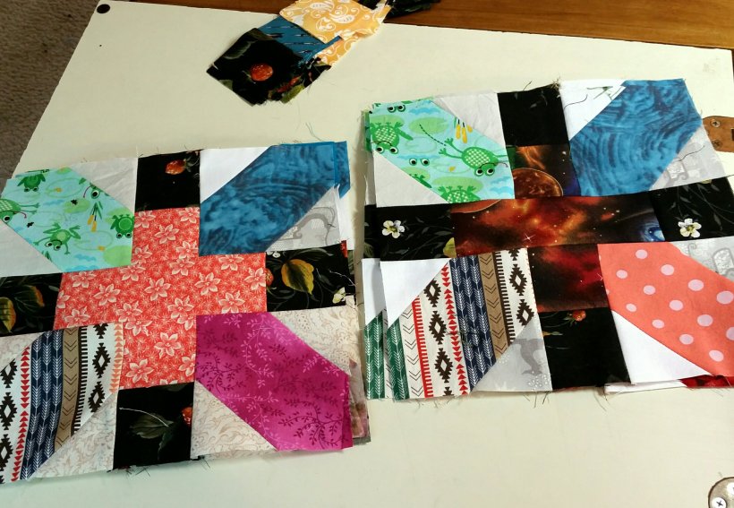 I’ve never done these cross-plus blocks before, but they are very easy. Choosing colors is harder, as you can see from mine, but I’m learning. One thing that I like is that it uses scrap sizes I already have cut, and it’s perfect for bright or novelty fabrics that don’t always fit in other places.