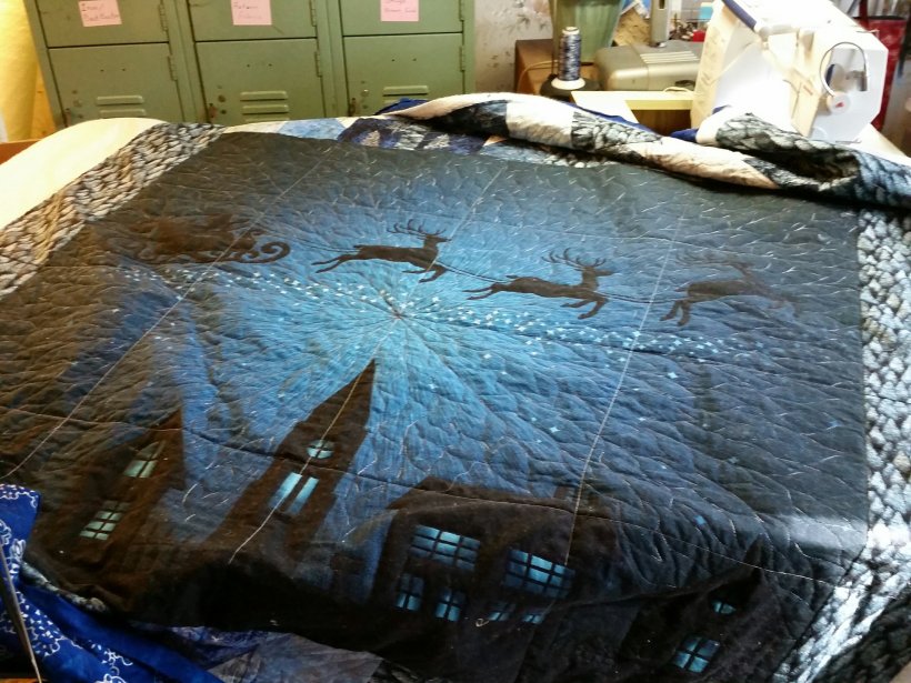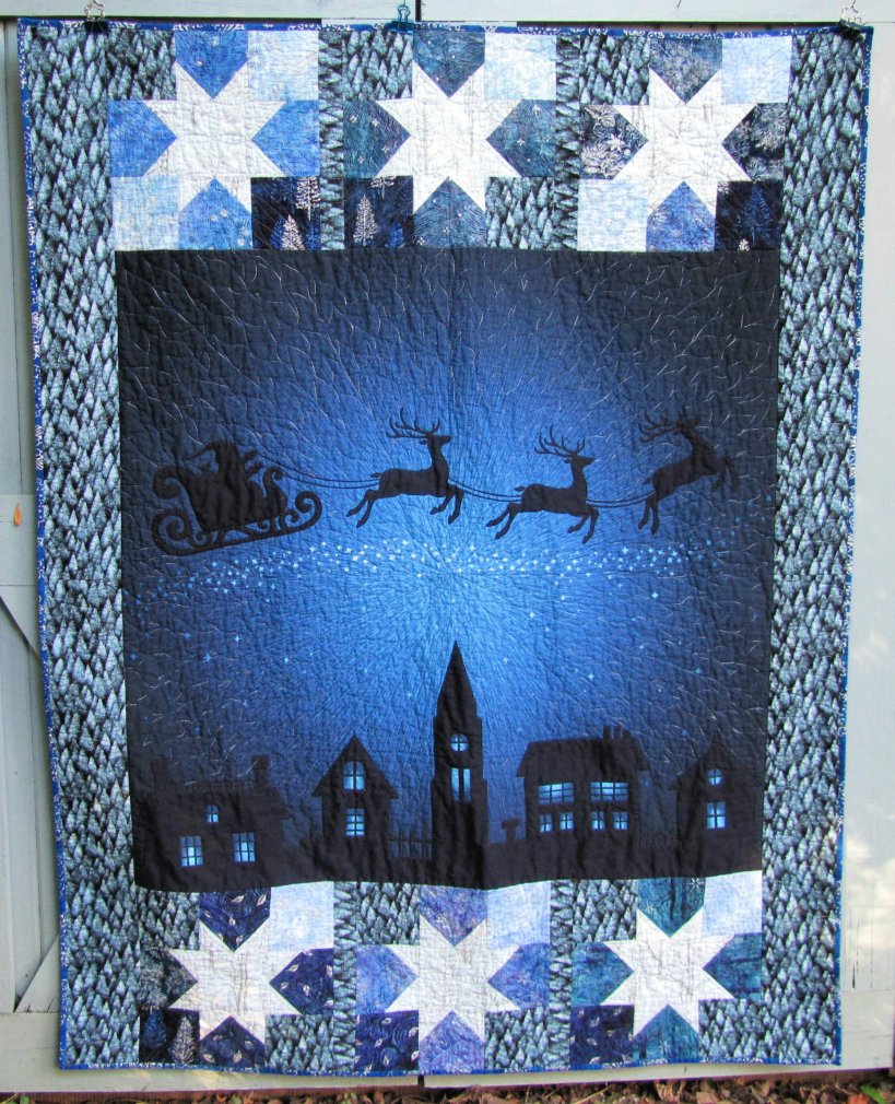The stars are quilted with gray Bottom Line, the buildings and sleigh with black BL, and the sky and border with navy and white Fantastico.