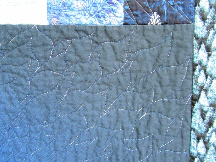 I really like the way the quilting in the sky looks. I made sort of flame shapes from the center out. Close to the center, the thread hardly shows, but the white parts begin to show up in the dark edges of the sky.