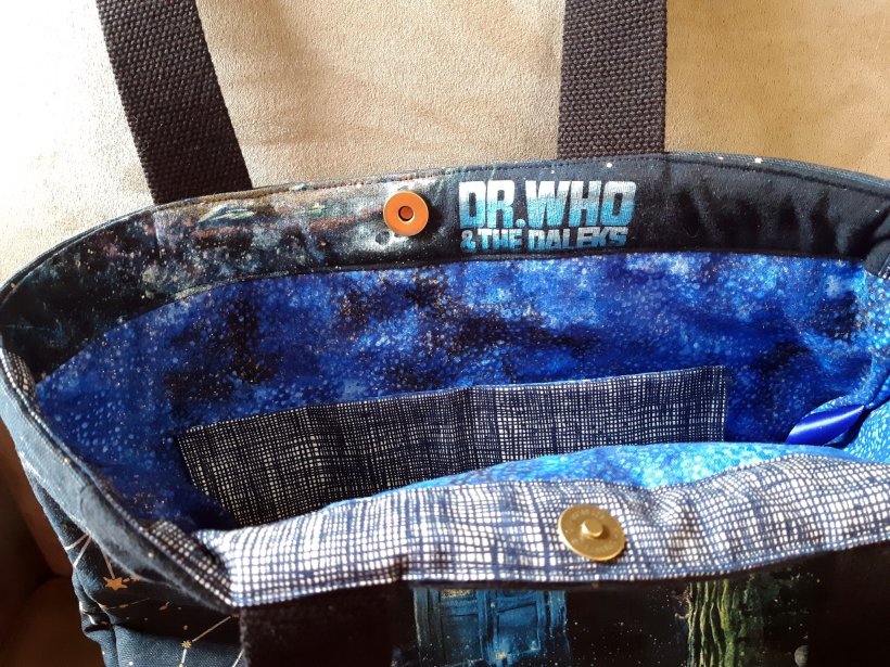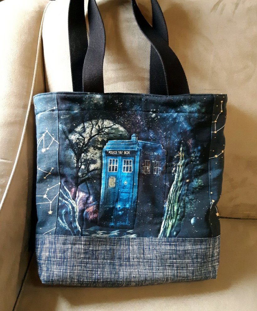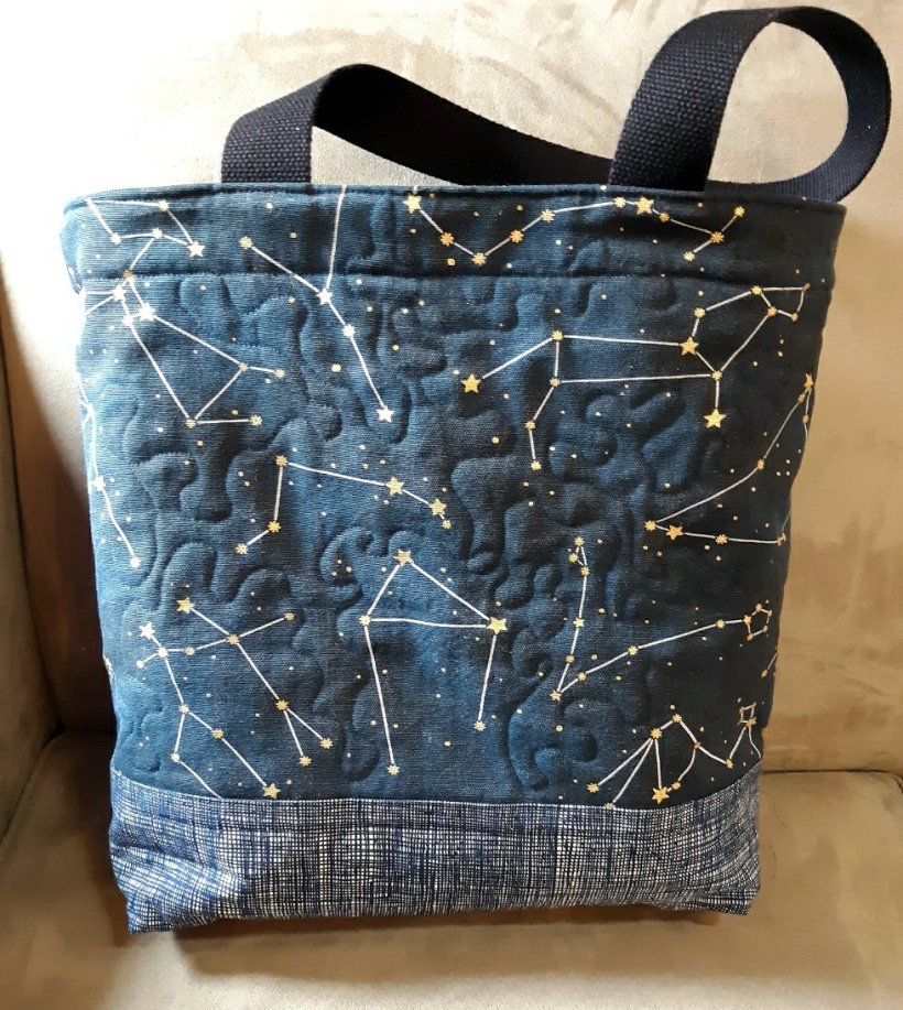 I used Shapeflex on the back of the t-shirt panel, and fusible fleece on the back the of whole outer bag, once I’d sewn on the contrasting bottom panels. Then I did a little timey-wimey quilting (sorry!) to keep the layers together.