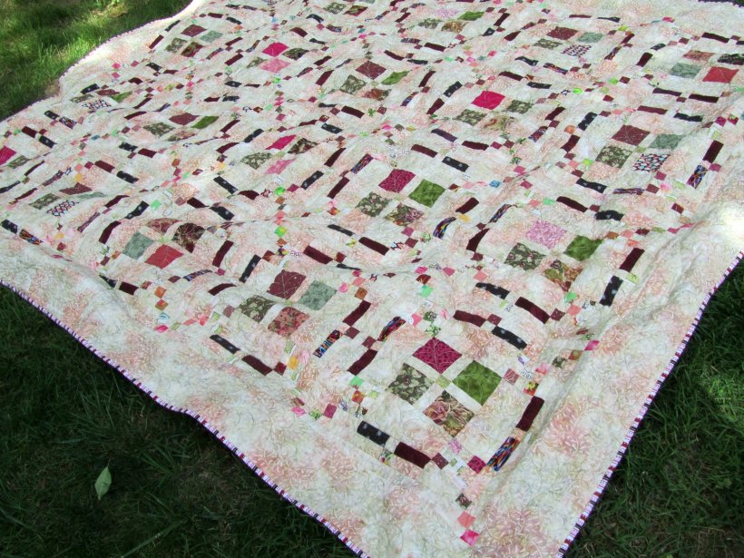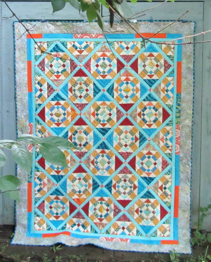 I really like those mini Trip Around the World blocks on point. The triangles in the corner are very effective. The colors you chose are fabulous.