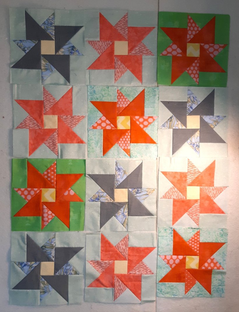 I know it’s a bad picture, but these are my blocks for Kat’s Covered in Love drive for this month. The real colors are pink, orange, and blue. I encourage you to try this block. It isn’t hard, but you have think about it a little. Watch while trimming the second units that you don’t cut off any points. Ask me how I know…