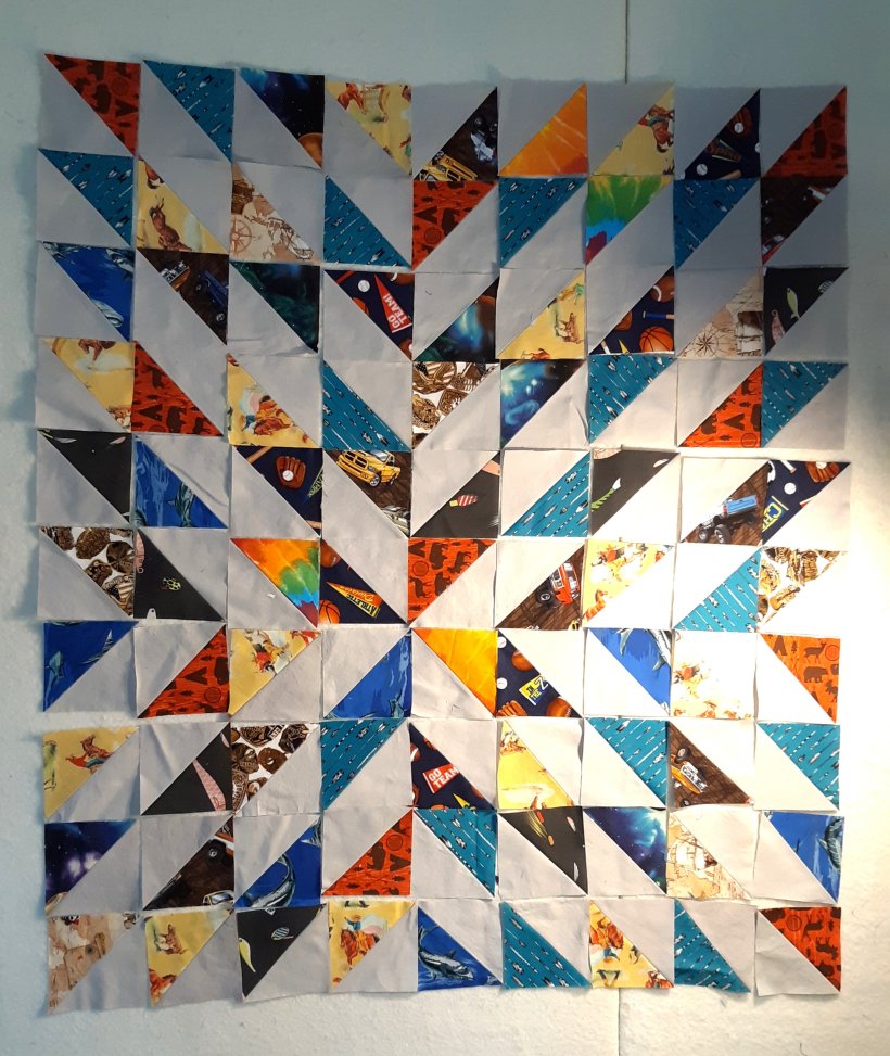 These are bonus HSTs left from a commissioned quilt I made last year. They’re 4.5″ square, and this will be a baby quilt.