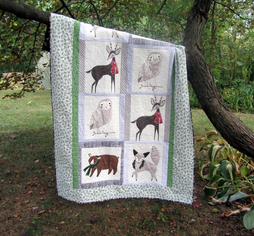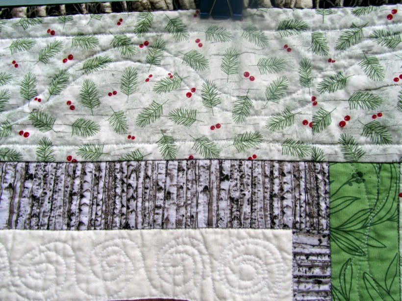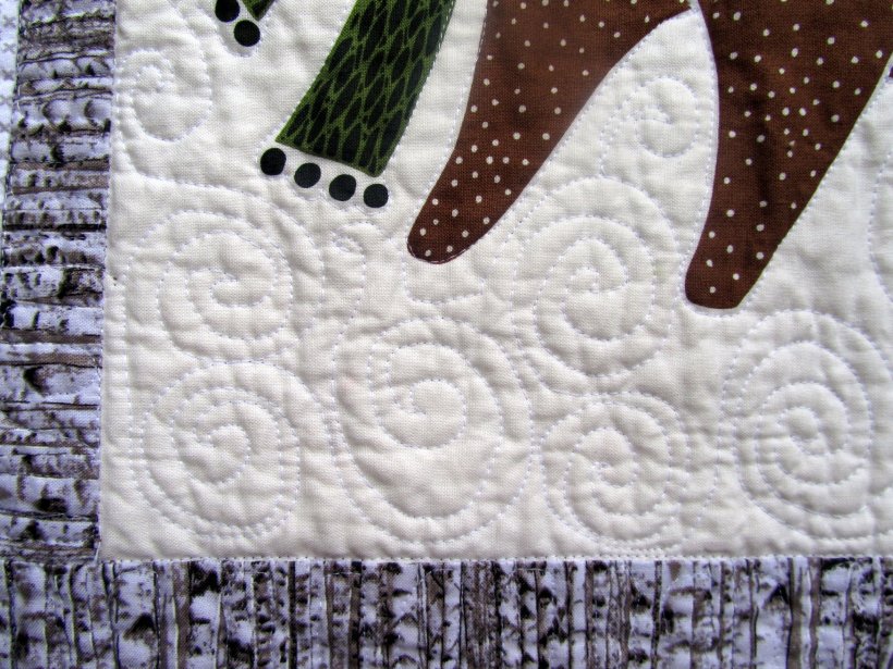 The panel is part of “Merriment” by Moda. When I bought it, I really had no idea of the scale of the animal segments. (There is also a panel with smaller animals.) The Etsy seller gave the measurements and had good photos, but I just didn’t realize that each animal was a fat quarter! So I cut them down a lot (two panels), then framed them back up to 16″ square. My first 8 block quilt!
