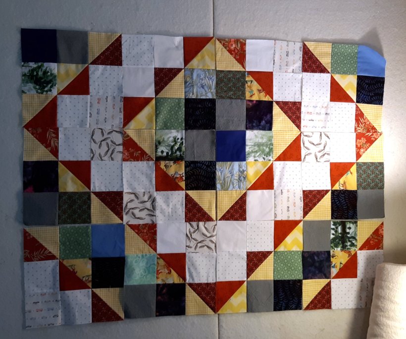 Continuing to bust the scraps with these string blocks. Don’t these put you in the mood? And, for once, I can see a difference in the scrap bin!