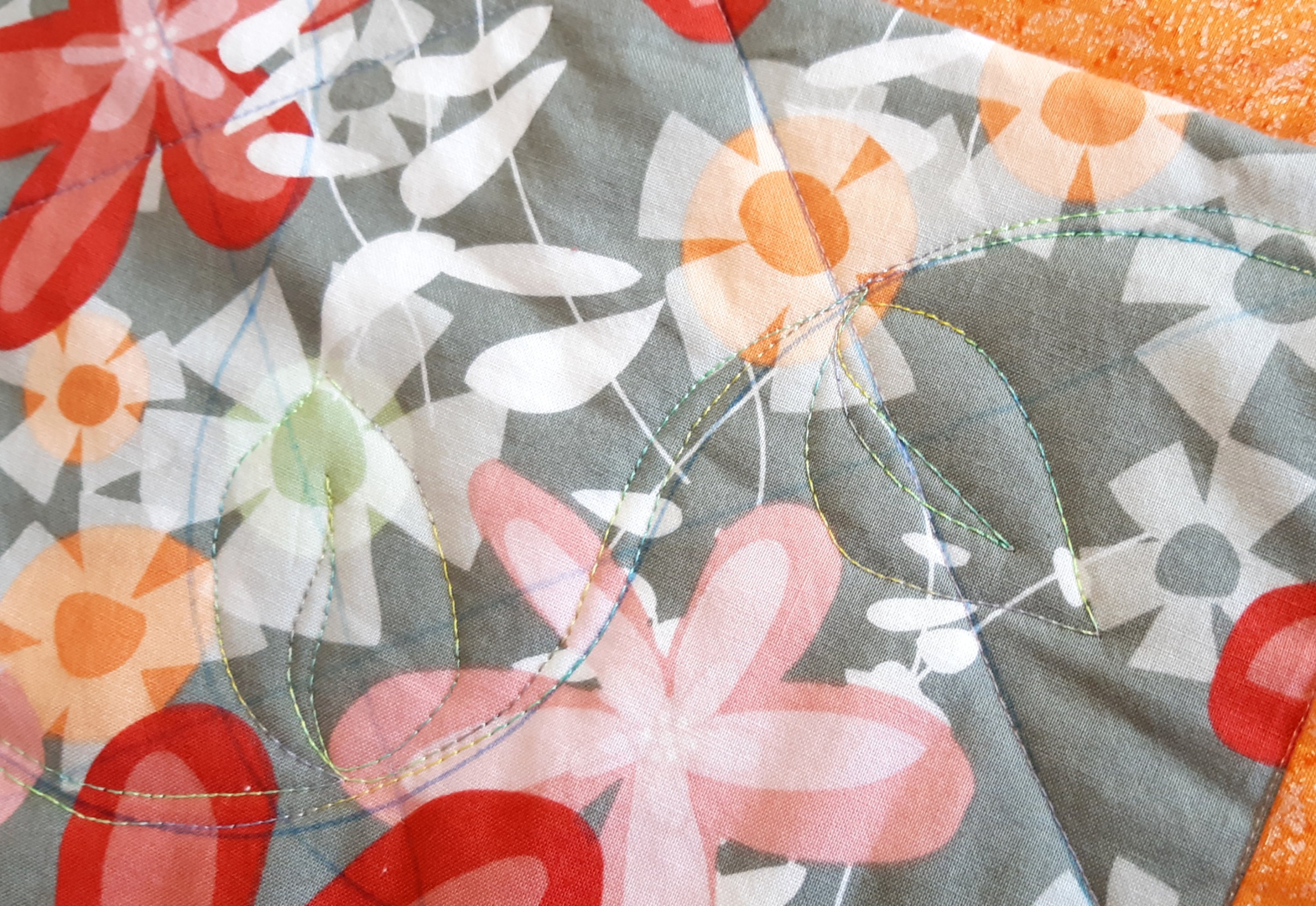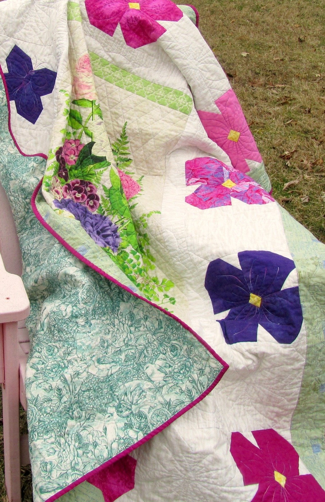 This back is a piece of Alexander Henry fabric I’ve had a looong time. It’s beautiful, but I never found a use for it, so I designed the quilt for it. I have something similar in blue/purple, so look for that sometime in the future.