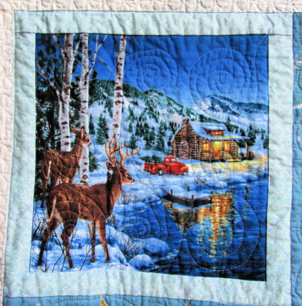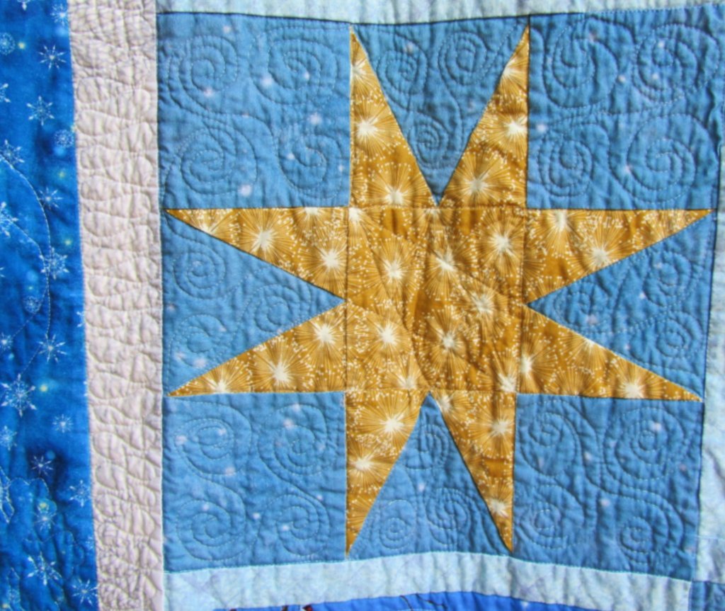 Also, it was hard to coordinate the blues from my random selection of snowy fabrics. At first I used a dark dusty blue to frame the scenes. I really liked the fabric (and am sad it’s reduced to scraps), but it wasn’t right. The light blue I used instead actually has bits of lavender in it, but, strangely, it worked better.