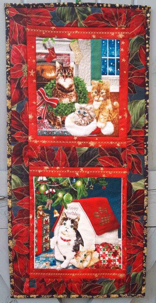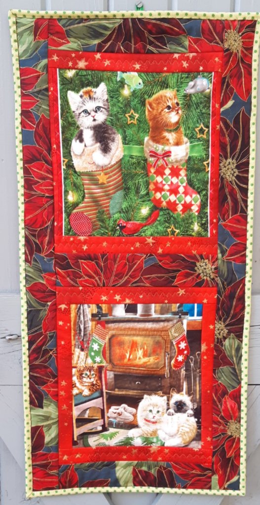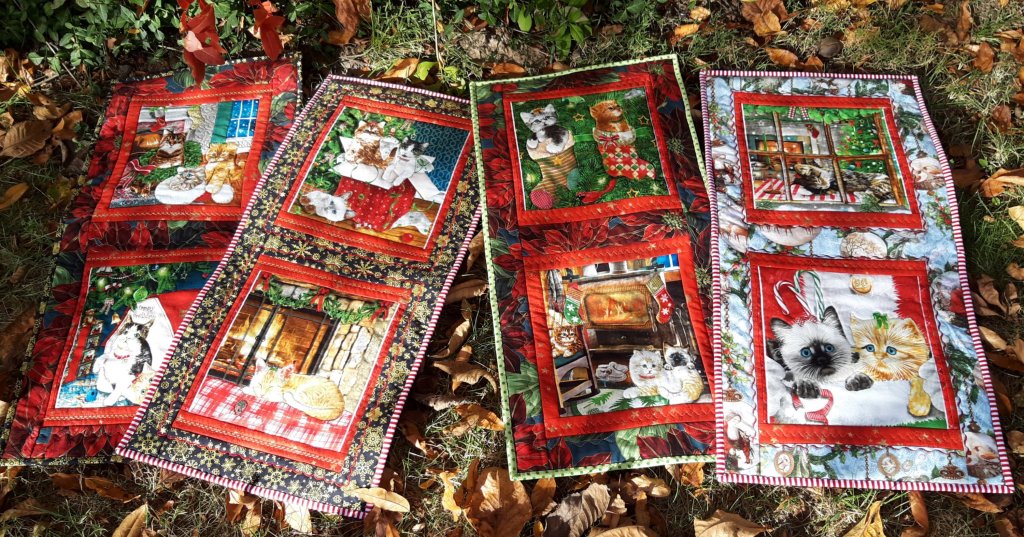 I finished the four Christmas kitty wall hangings. They’re square. The door I photographed them on wasn’t flat.