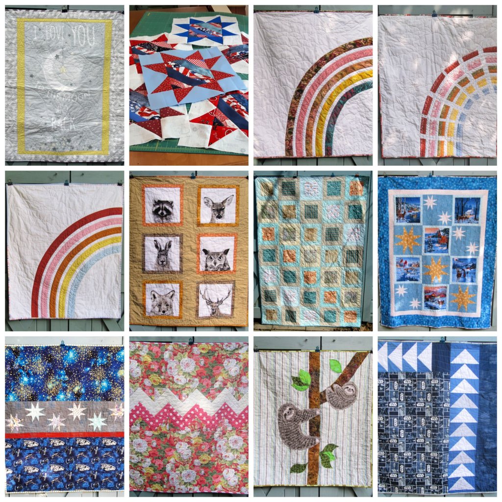 Lots of sloths, rainbows, and Star Wars. Twelve of these sold in my Etsy shop. One quilt and all the loose blocks were donated. And the iconic 2020 masks.