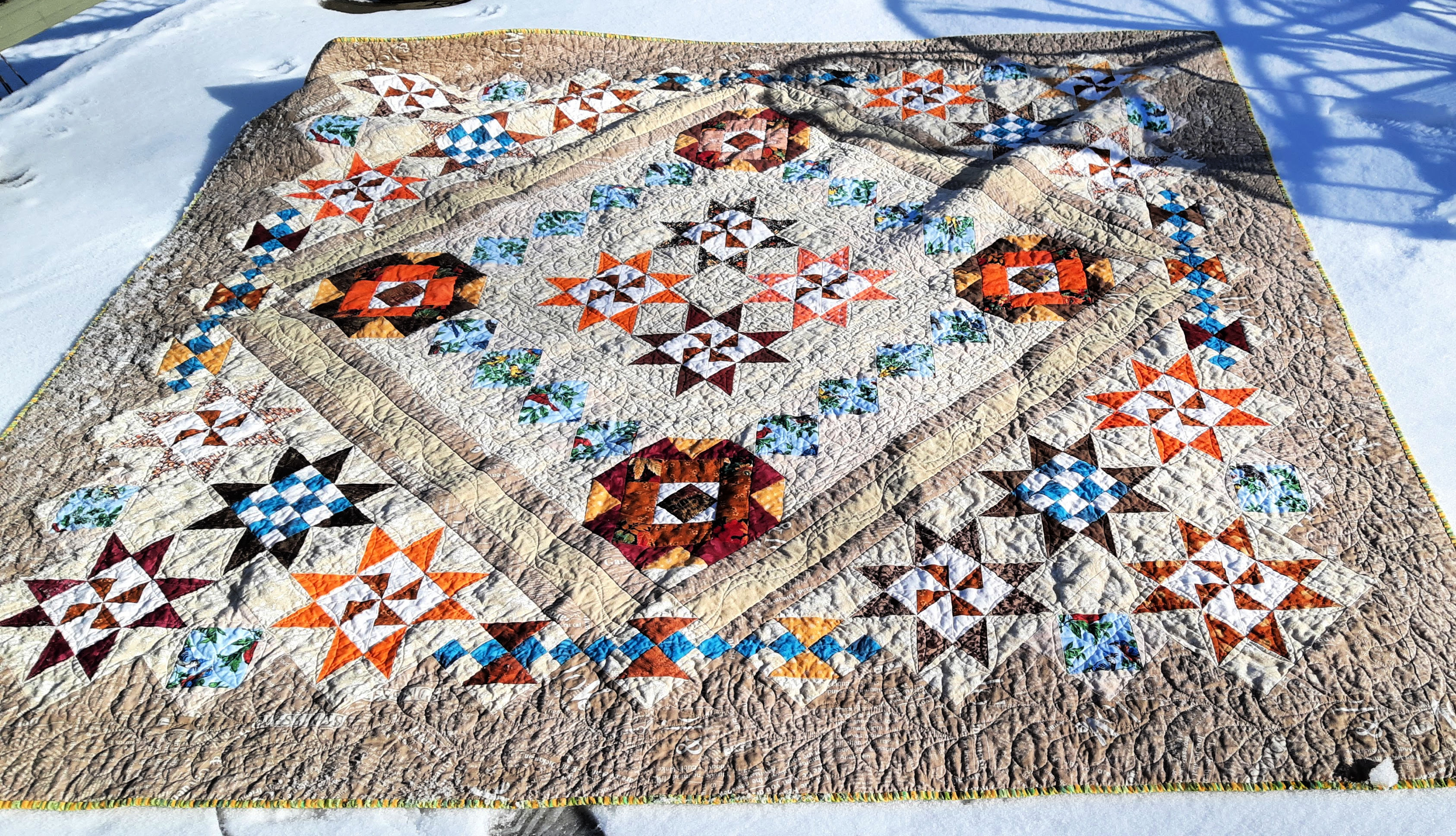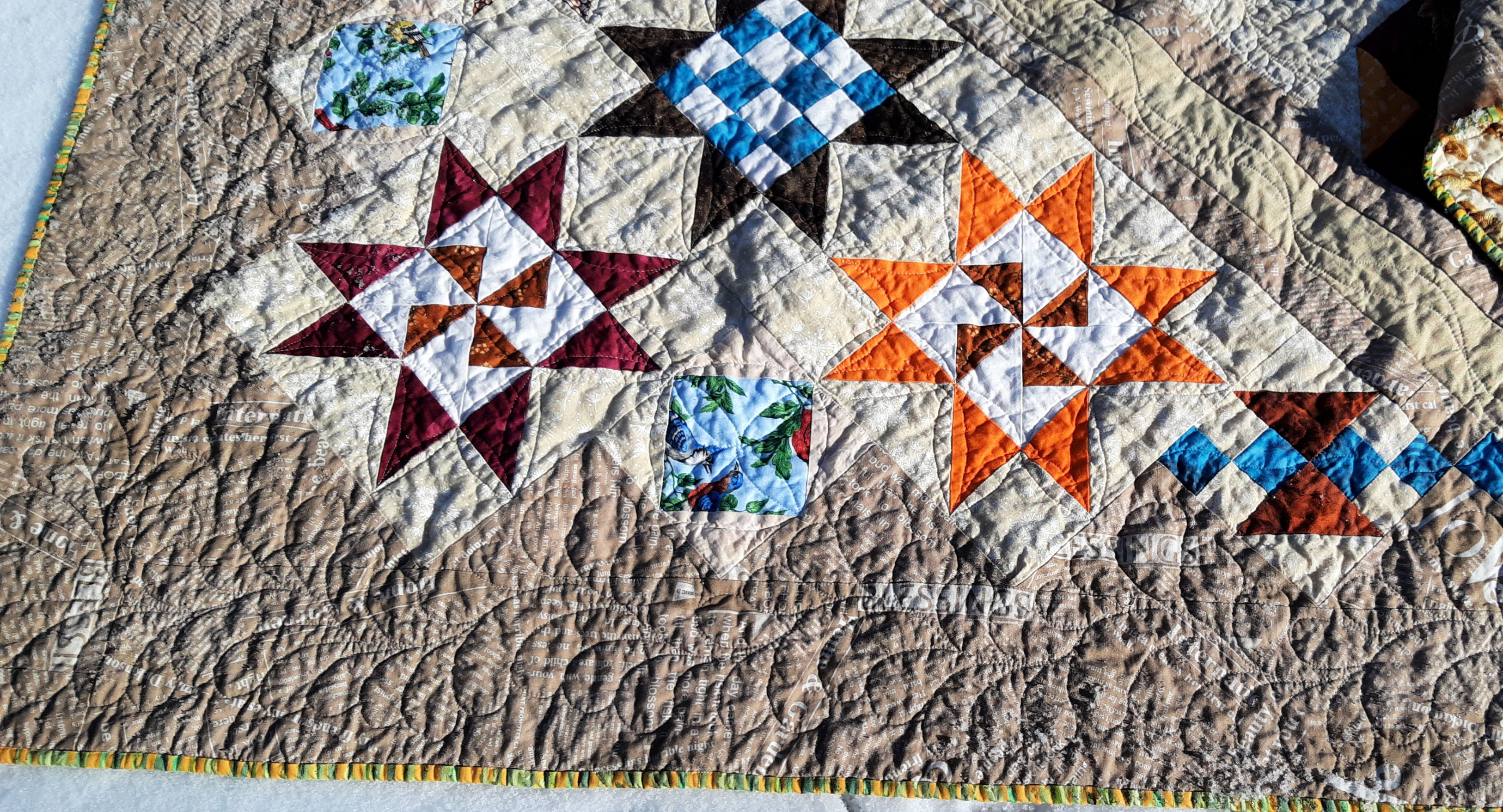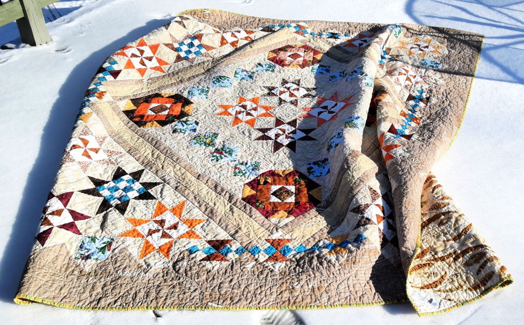 It did use a lot of scraps. The only thing I purchased was the brown outer border fabric, and the feather fabric for the backing.
