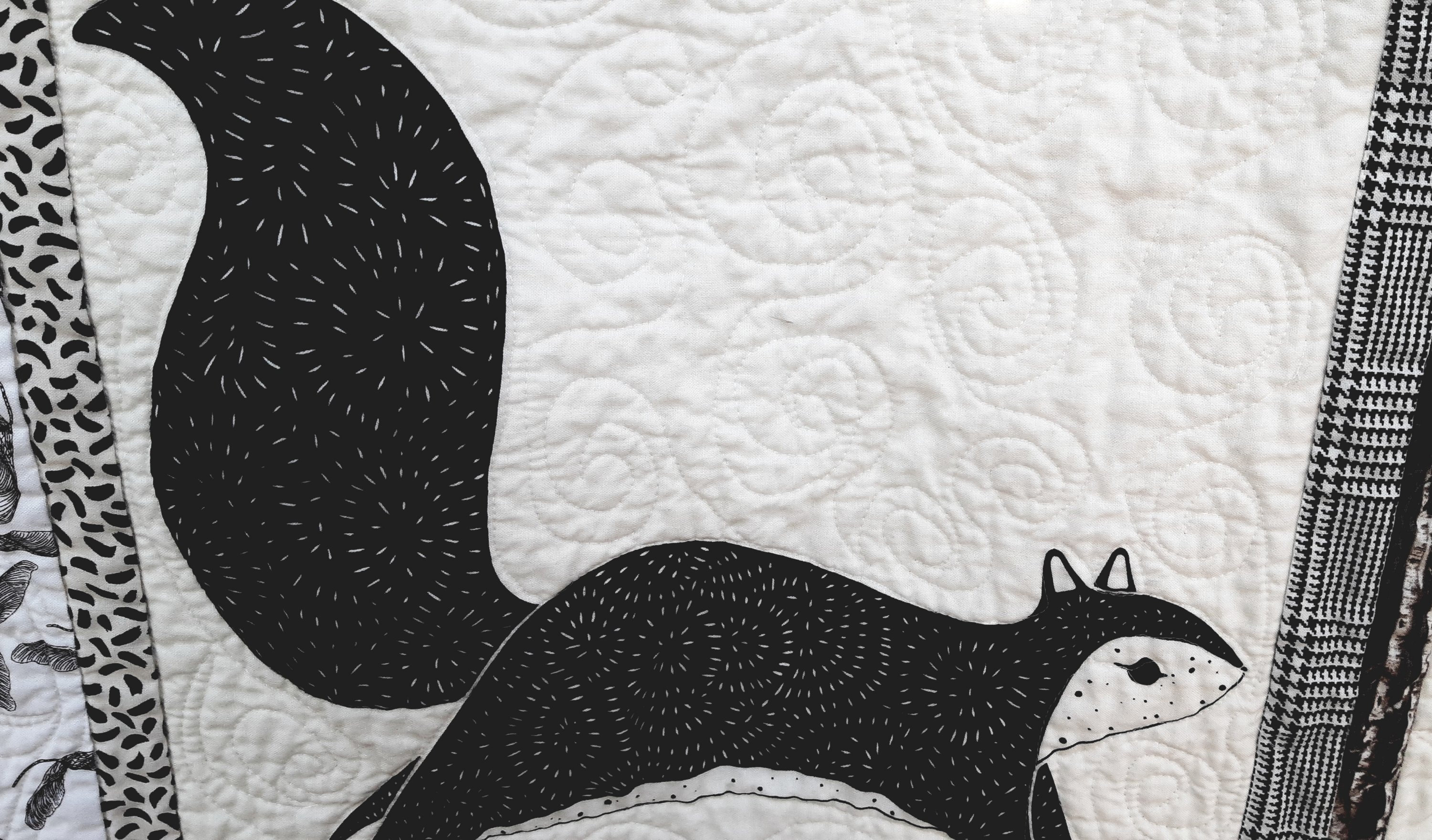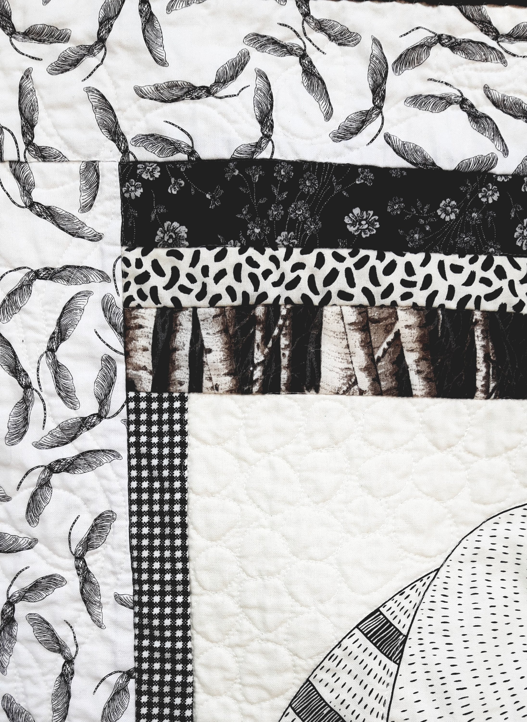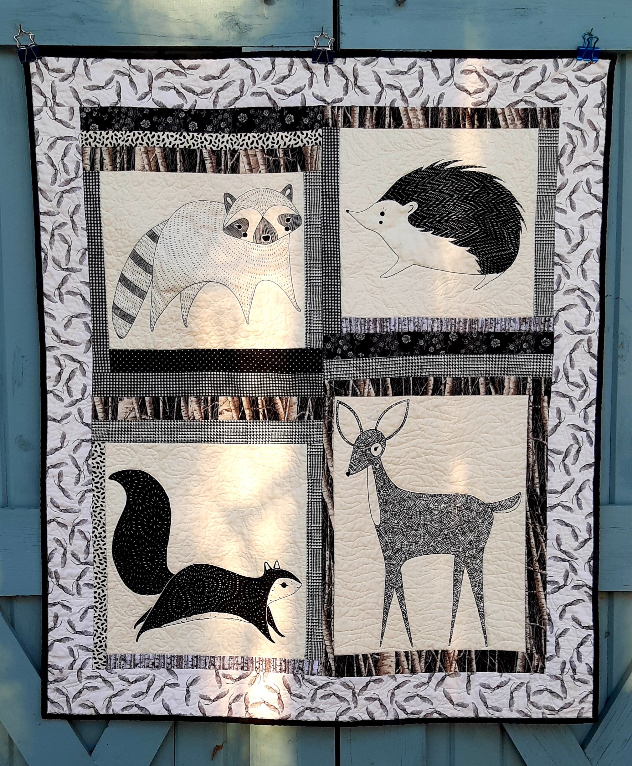 I found this animal panel (“Bramble” by Moda) and the glen plaid for the backing. The animals have great patterns, and I thought it would be fun to add more small cream and black prints around them. It was, but pretty soon my eyes were throbbing from all that pattern.