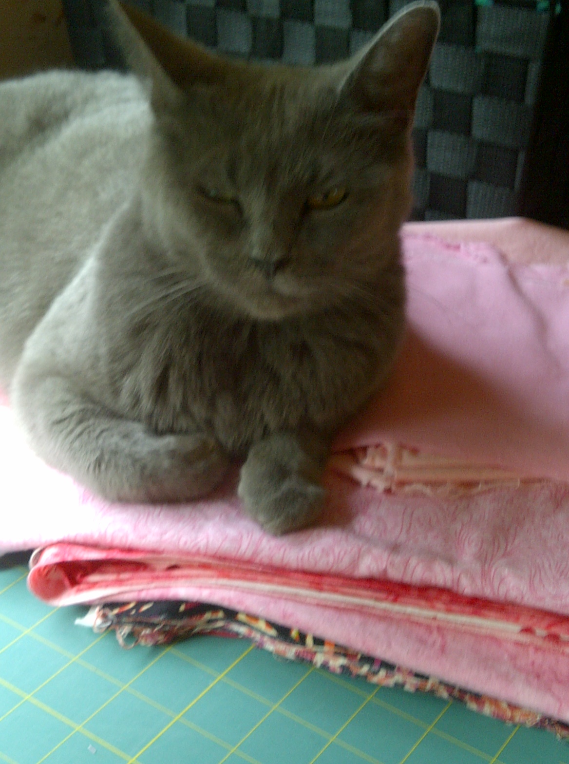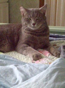 Yuri G. is our youngest, and the most apt to show up in quilt pictures. He is a rescue from behind an abandoned building. Rough and tumble, no neck, a very blue-collar cat, but devoted to me. A great hunter.